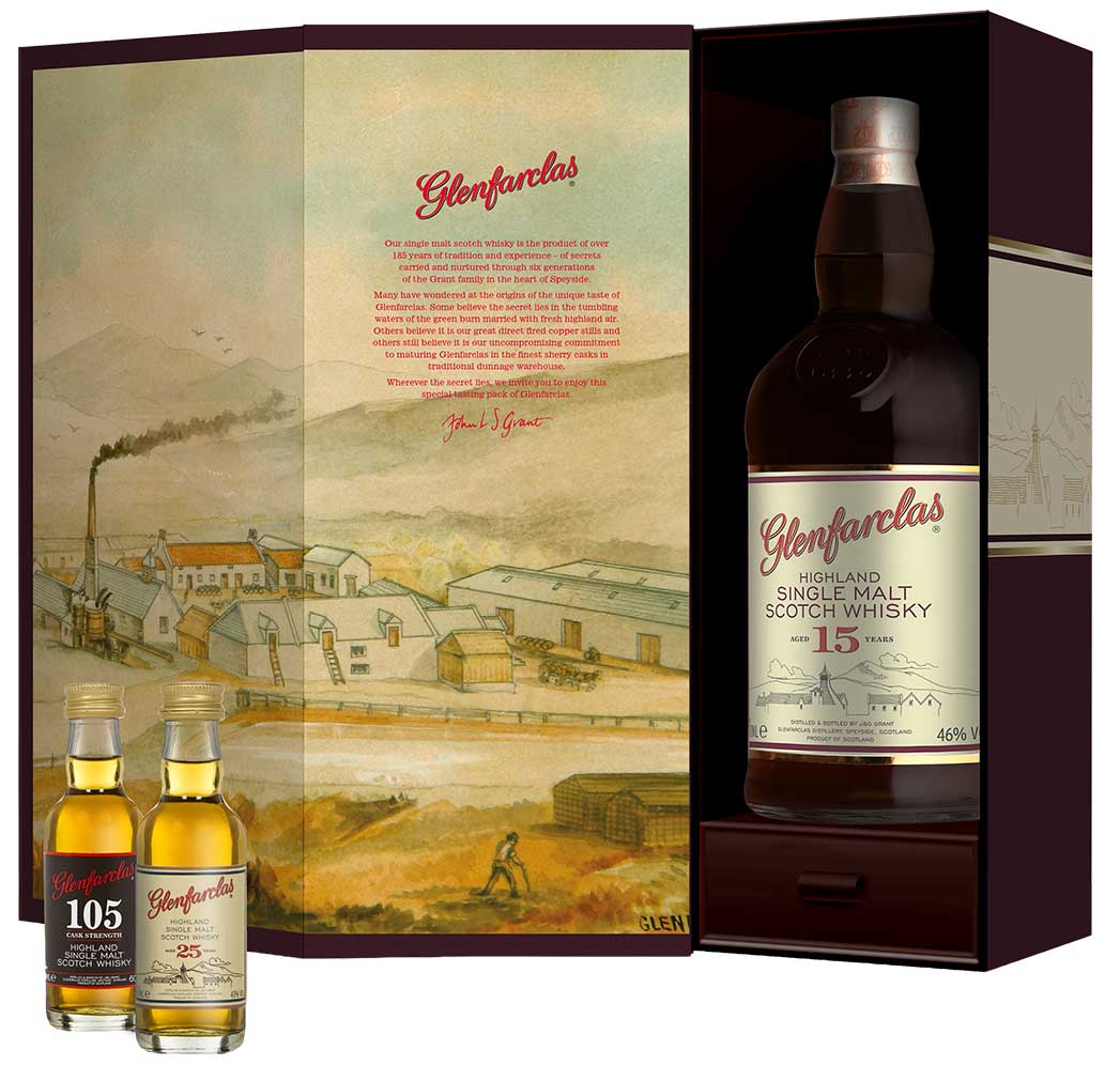 Der Glenfarclas 15 Jahre präsentiert sich gemeinsam mit den 5cl Miniaturen Glenfarclas 105 & Glenfarclas 25 Jahre in einer neuen edlen Premium Geschenkpackung geziert von einer Zeichnung der Traditionsbrennerei und der atemberaubenden Landschaft der Speyside. Ideal zum Verschenken oder zum selbst Genießen, lädt das neue Gift-Pack zu einem Glenfarclas-Erlebnis ein, die drei ausgezeichneten Klassiker der Brennerei zu verkosten!