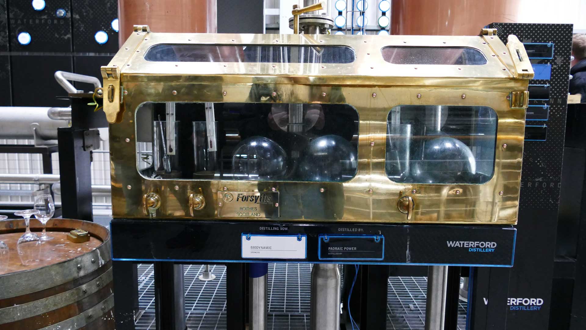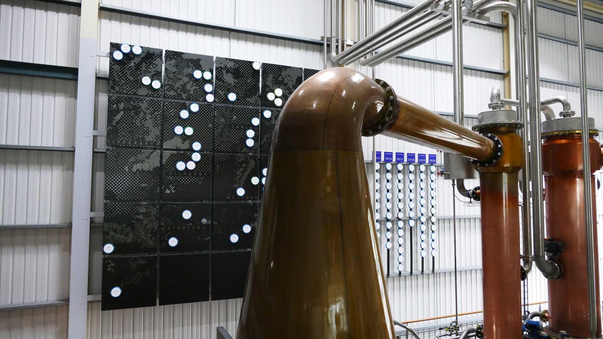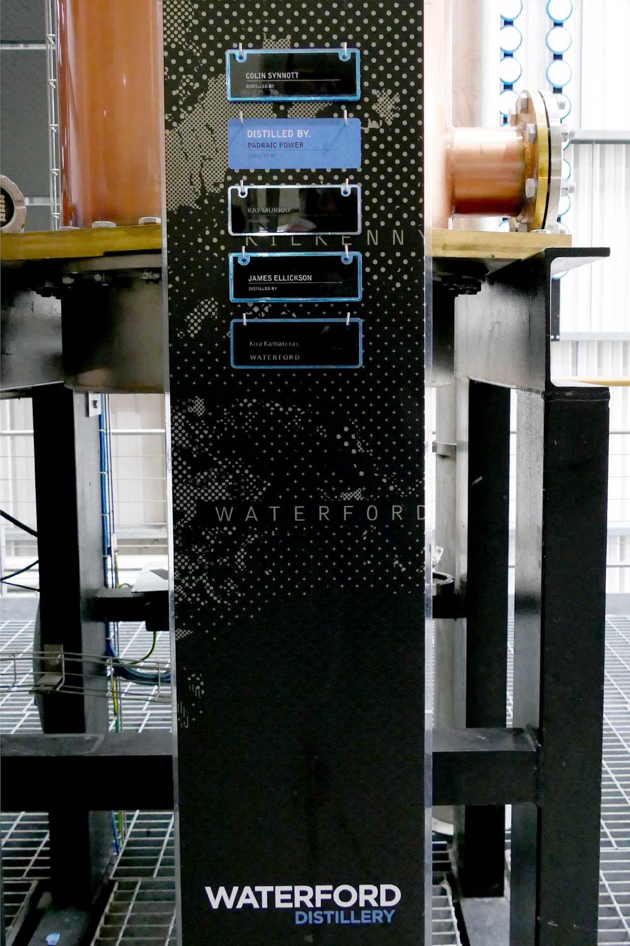 Bei unserer ersten Station treffen wir auf eine alte Bekannte: eine der Inverleven Stills, die vor Bruichladdich standen und aus der noch heute jeder bislang veröffentlichte Whisky von Waterford stammt. Dann geht es weiter zu den neuen Stills, bevor wir uns die besondere Hydromill, den Mash Filter (ein sehr ausgefallener, aber kluger Ersatz für einen Mashtun) und danach die Fermentationstanks ansehen.