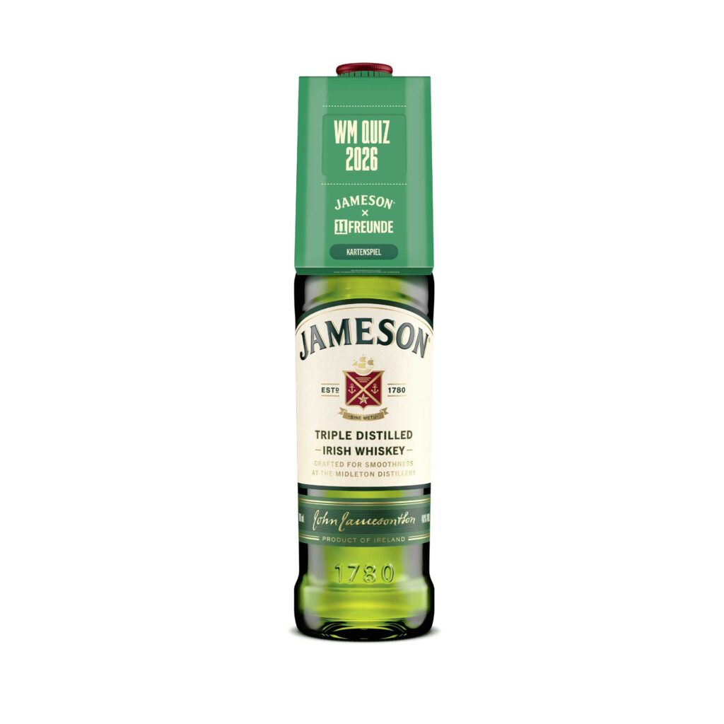 Passend zur bevorstehenden Fußball-WM sorgt Jameson für spielerische Aktivierung am POS. Unter dem Motto „WM ist, wenn alle zu Experten werden“ enthält die Aktionsflasche ein gratis WM-Quiz, das zum Mitraten und gemeinsamen Genießen einlädt und für zusätzliche Interaktion im Handel sorgt. Entwickelt wurde das Kartenspiel in Kooperation mit dem Partner 11FREUNDE, mit dem Jameson bereits erfolgreiche Projekte, wie etwa ein deutschlandweites Kneipenquiz, umgesetzt hat.