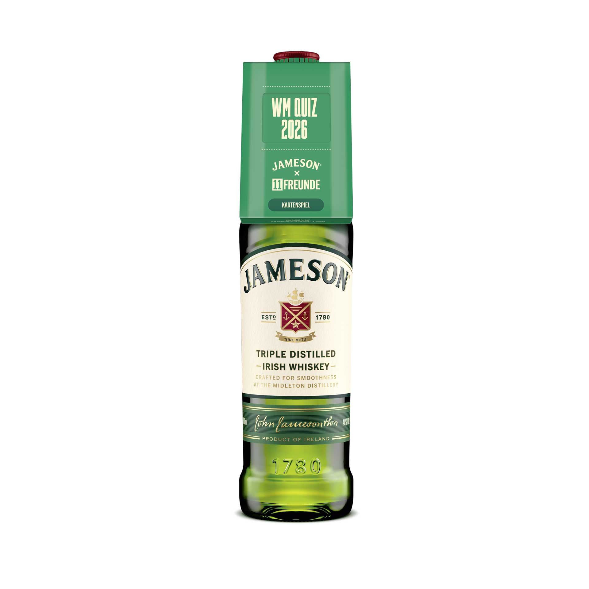 Passend zur bevorstehenden Fußball-WM sorgt Jameson für spielerische Aktivierung am POS. Unter dem Motto „WM ist, wenn alle zu Experten werden“ enthält die Aktionsflasche ein gratis WM-Quiz, das zum Mitraten und gemeinsamen Genießen einlädt und für zusätzliche Interaktion im Handel sorgt. Entwickelt wurde das Kartenspiel in Kooperation mit dem Partner 11FREUNDE, mit dem Jameson bereits erfolgreiche Projekte, wie etwa ein deutschlandweites Kneipenquiz, umgesetzt hat.