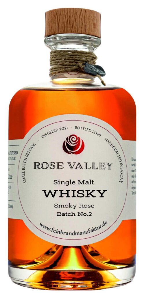 Die Basis des „Smoky Rose Batch 2“ ist ein sächsischer Single Malt Whisky, der vollständig in Madeira-Fässern reifen durfte. Diese Fässer verleihen ihm eine edle Fruchtnote und eine sanfte Würze – Aromen, die man unter anderem von Rosinen, kandierten Zitrusfrüchten und warmem Eichenholz kennt. Zum krönenden Abschluss erhält dieser Whisky durch ein Ex-Laphroaig-Fass seine charakteristischen Torfnoten – dezent, aber unverkennbar.