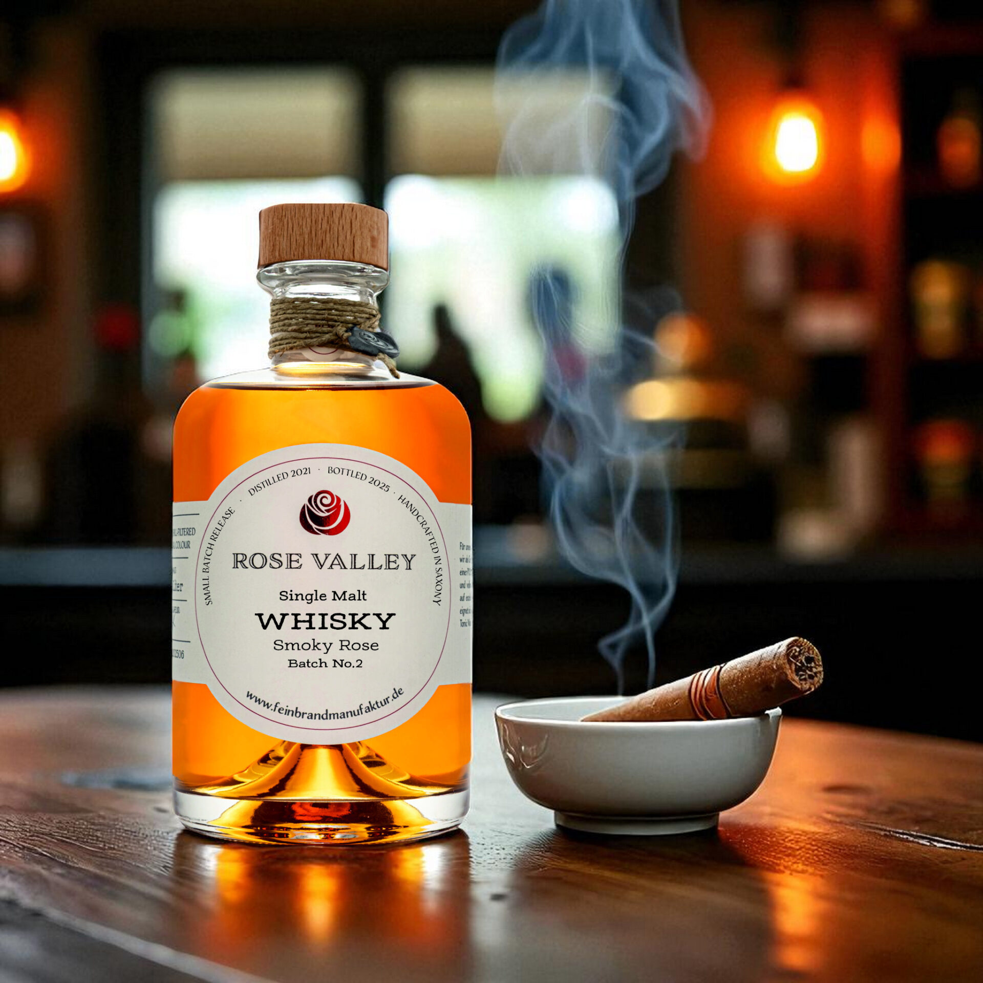 Die Basis des „Smoky Rose Batch 2“ ist ein sächsischer Single Malt Whisky, der vollständig in Madeira-Fässern reifen durfte. Diese Fässer verleihen ihm eine edle Fruchtnote und eine sanfte Würze – Aromen, die man unter anderem von Rosinen, kandierten Zitrusfrüchten und warmem Eichenholz kennt. Zum krönenden Abschluss erhält dieser Whisky durch ein Ex-Laphroaig-Fass seine charakteristischen Torfnoten – dezent, aber unverkennbar.