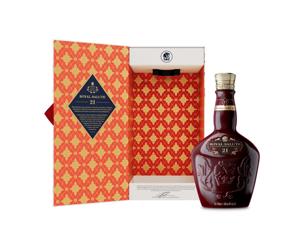 „The Lunar New Year is a time of vibrant celebration, rich tradition, and the promise of new beginnings. Our Lunar New Year Edition, with Emily Carter’s extraordinary artistry, perfectly encapsulates this spirit of grand celebration. Royal Salute has always been crafted for the most momentous occasions, and this exquisite expression offers those celebrating the perfect toast to prosperity and joy, making every Lunar New Year gathering truly unforgettable.“