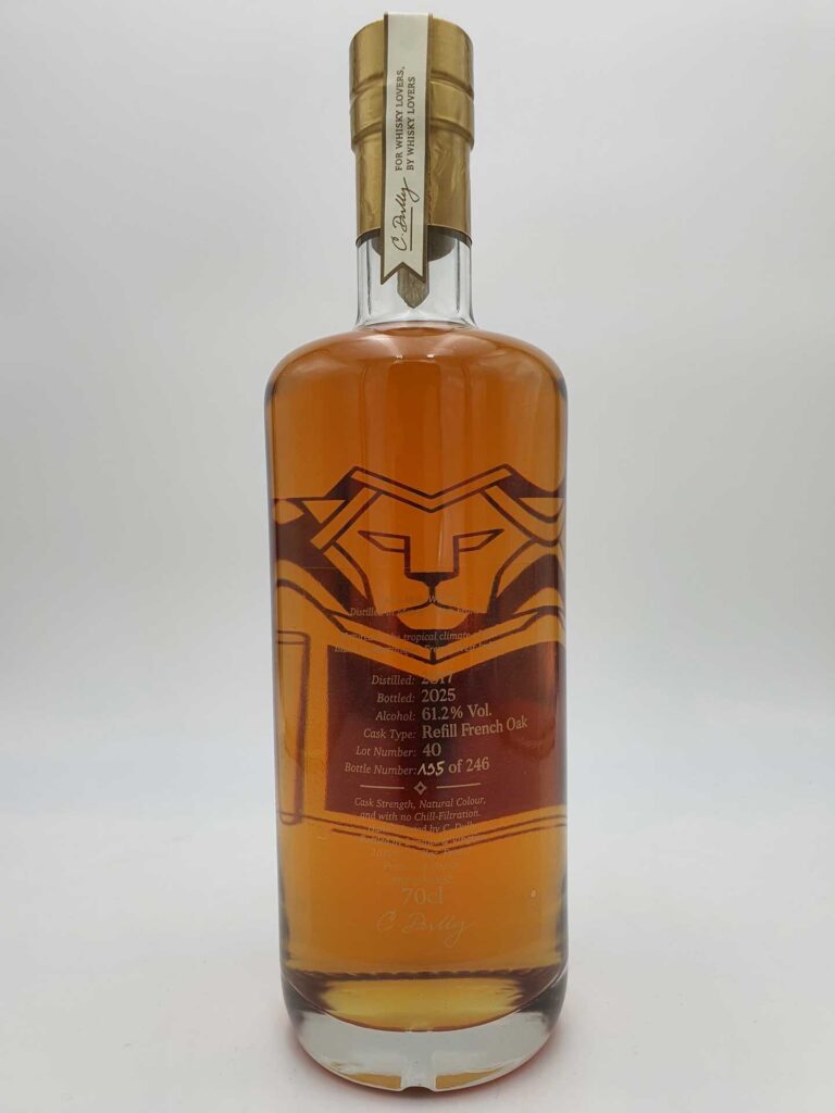 Gaumen: Ein echtes Kraftpaket – vollmundig, cremig und gleichzeitig vibrierend lebendig. Die Textur ist fast ölig, mit intensiver Frucht und tiefem Eichencharakter. Mango, Bananenbrot, brauner Zucker und kandierte Zitrusfrüchte treffen auf würzige Vanille, Pfeffer, etwas Ingwer und eine Spur Zimt. Der Einfluss des karibischen Klimas zeigt sich in der Reife und Rundheit: der Whisky wirkt älter, komplexer und „reifer“, als es das Alter vermuten lässt.
