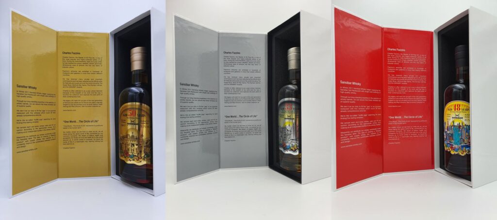 Sansibar Whisky bringt 3 neue hochwertige Abfüllungen auf den deutschen Whiskymarkt. Die Labels der Abfüllungen wurden vom berühmten New Yorker 3D Pop-Art-Künstler Charles Fazzino gestaltet. Sie zeigen angelehnt an das Kunstwerk „The Circle of Life“ Ausschnitte der Welt in den Bereichen Amerika, Asien und Europa. Charles Fazzino verarbeitet darin seine Eindrücke aus vielzähligen Reisen rund um den Globus.