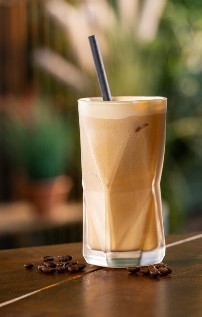 - In ein mit Eis gefülltes Glas abseihen, nach Wunsch mit Kaffeebohnen garnieren und servieren.