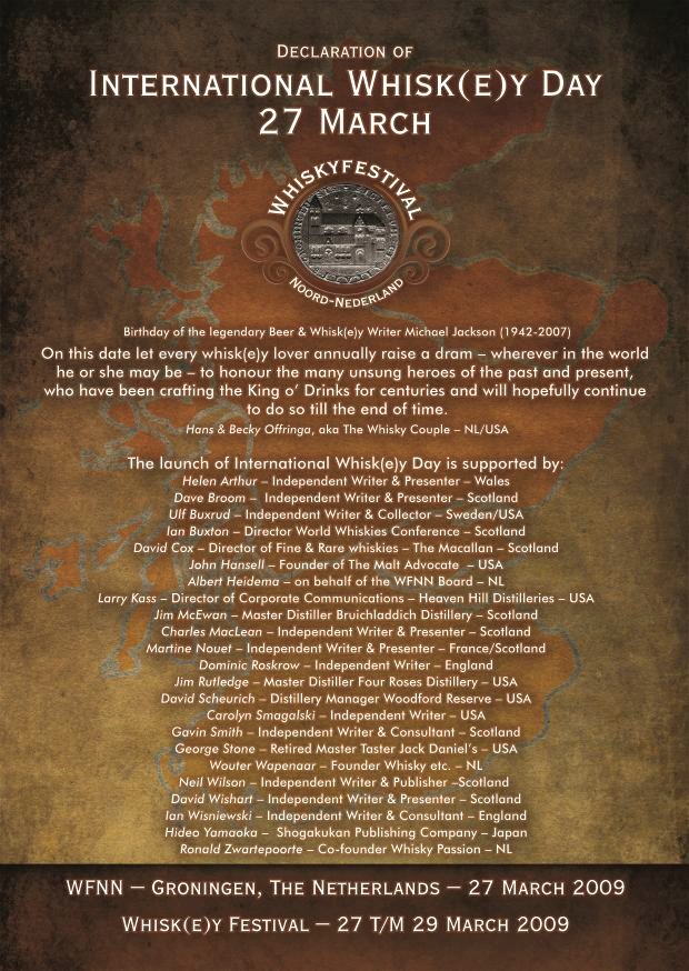 Heute ist wiederInternational Whisk(e)y Day zu Ehren des Whisky-Autors Michael Jackson, der leider viel zu früh verstarb. Der Tag wurde 2009 ins Leben gerufen, und zwar von Becky und Hans Offringa, gemeinsam mit einer Vielzahl von Whiskyfreunden, wie dieses Gründunsgmanifest zeigt, das uns Hans Offringa zur Verfügung gestellt haben: