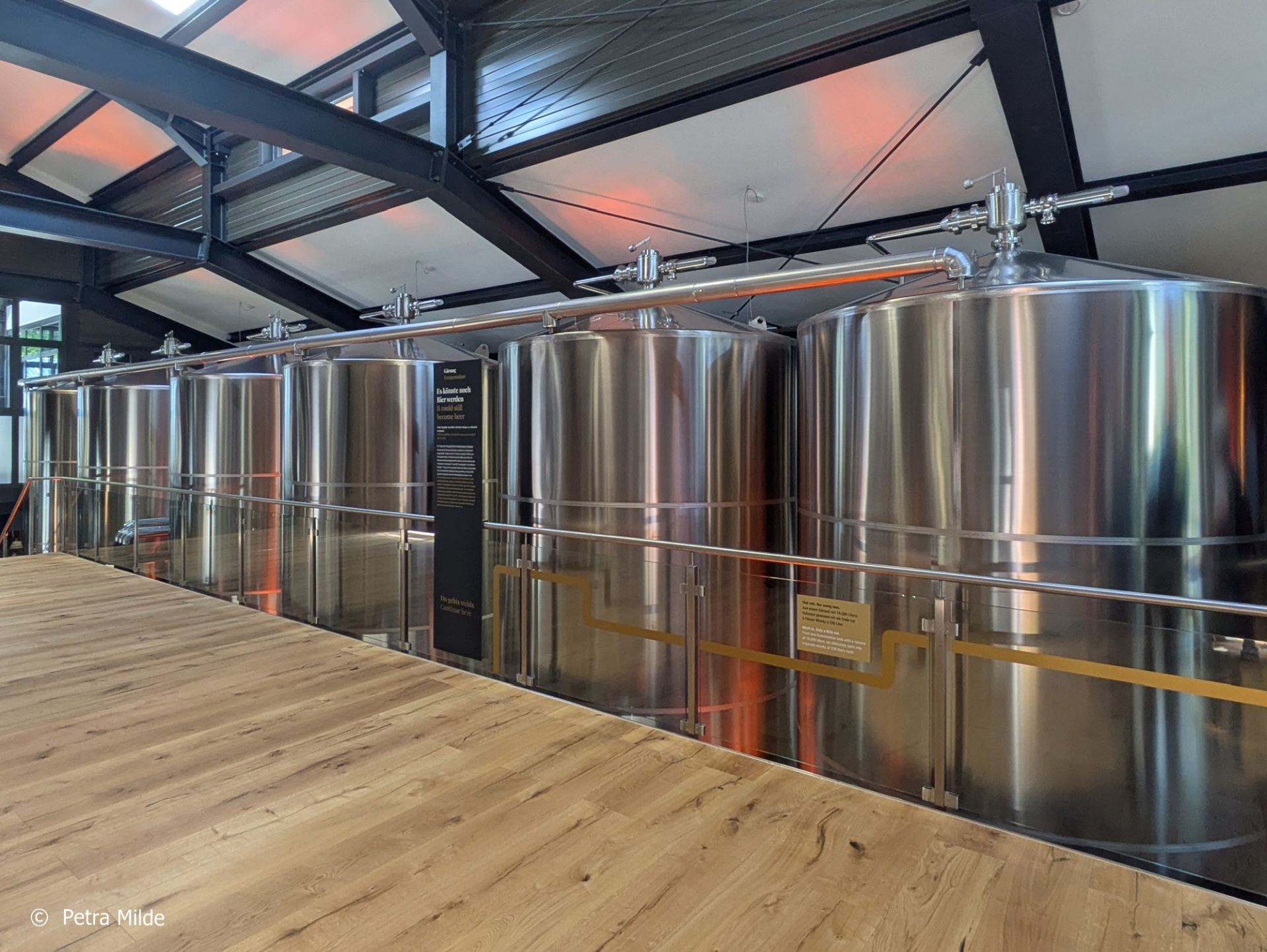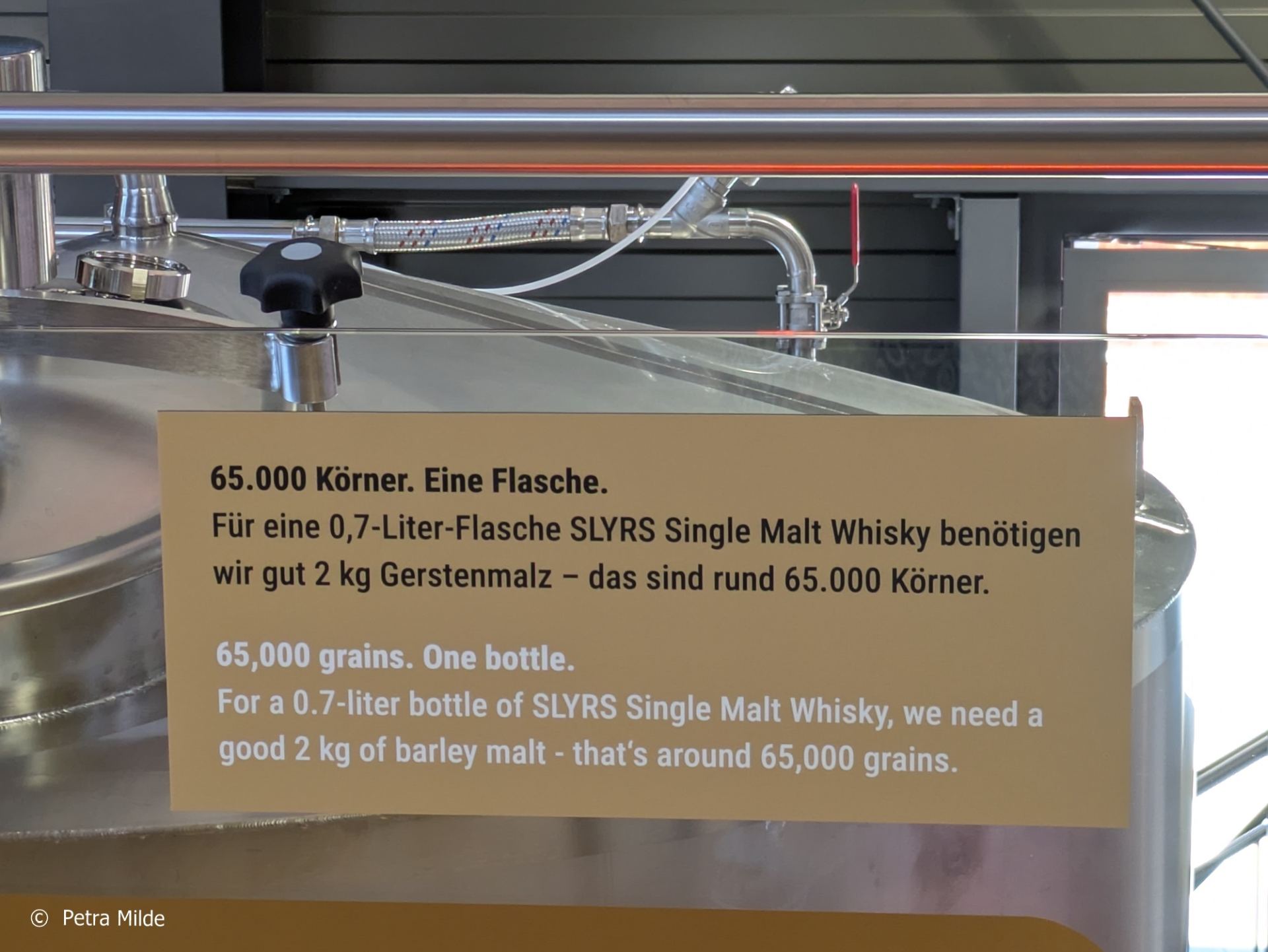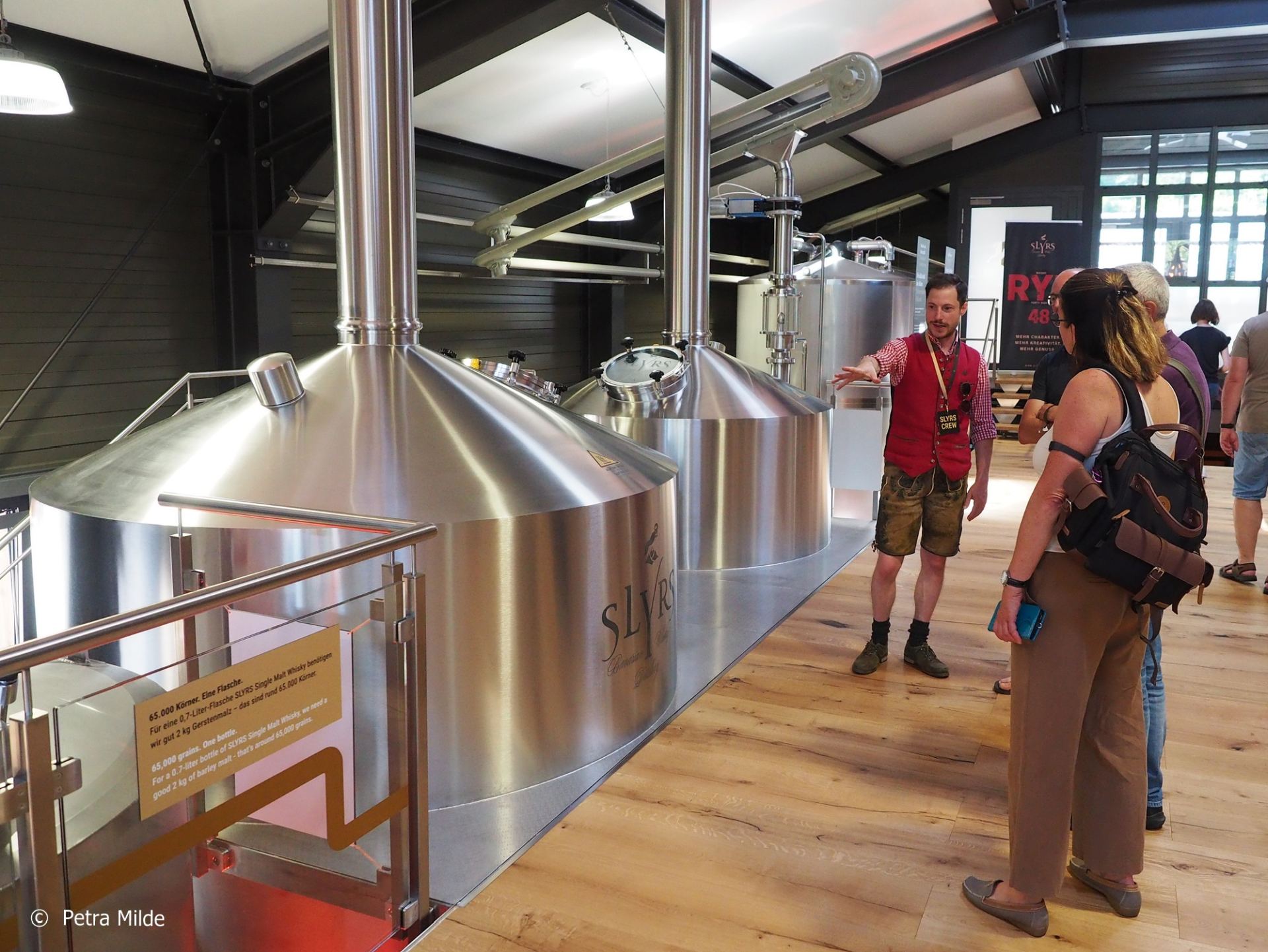 Das eigentliche Interesse der Gäste galt natürlich dem, was im Gebäudeinneren zu sehen war: Die neue Brennerei konnte unter Augenschein genommen werden. Auf regelmäßigen Touren konnte man sich herumführen und in die Geheimnisse der Whiskyherstellung einweihen lassen – ganz allgemein oder Slyrs-speziell. Wer sich lieber auf eigene Faust umschauen wollte (oder auch künftig will…), dem stehen ausführliche Informationstafeln zur Verfügung, wie man es bereits von der „alten“ Slyrs-Brennerei kannte.
