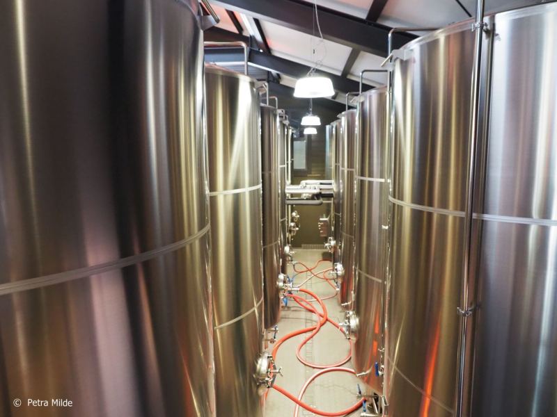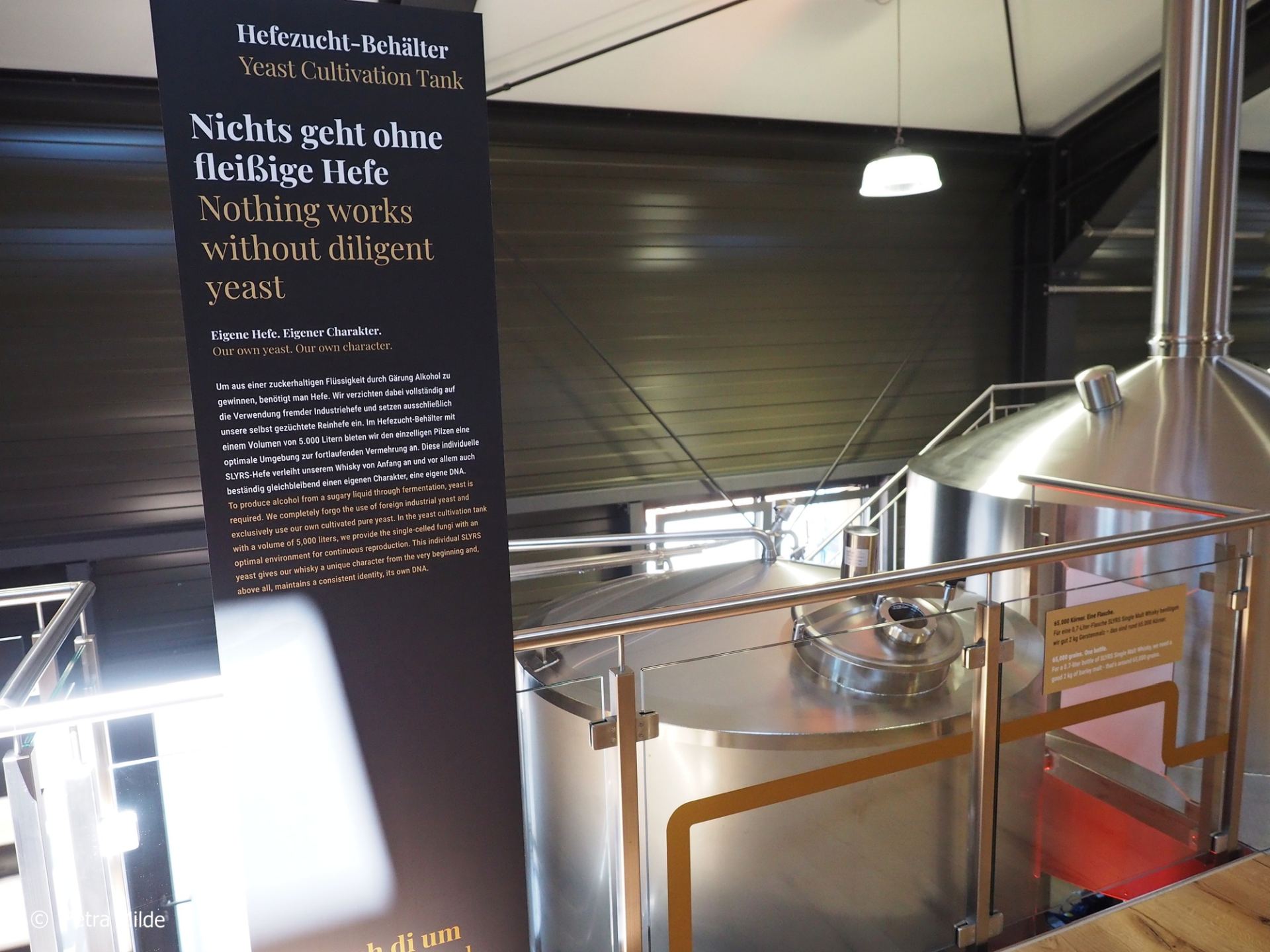 10 große Gärbehälter mit jeweils 10.000 Liter Volumen warten darauf, mit geläuterter Maische befüllt zu werden. Das Maischen geschieht in einem 2.500-Liter Maischebehälter, es sind also vier Ansätze nötig, um einen Gärbehälter zu füllen. Das verwendete Gerstenmalz wird in der Mühle im Eingangsbereich der Produktionshalle gemahlen, das Wasser kommt aus der Bannwaldquelle der Schlierseer Alpen. Die Hefe, die zum Gären zugesetzt wird, kauft Slyrs nun nicht mehr ein, sondern züchtet sie selbst als Reinhefe in einem 5.000-Liter-Behälter– eine Besonderheit, die man hauptsächlich von amerikanischen Whiskeybrennereien kennt.