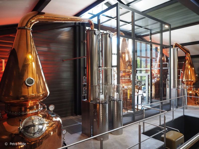 Die Brennblasen werden über eine Hochdruck-Wärmepumpe mit heißem Wasserdampf erhitzt, einem sehr modernen Verfahren. Die Abwärme beim Herunterkühlen des Destillats in den Kondensatoren wird über ein Wärmetauschsystem zum Anheizen der nächsten Maische benutzt – ein Kreislauf, der wesentlich zur Energieeffizienz der neuen Brennerei beiträgt. Diese eigene Abwärme und eine PV-Anlage auf dem Dach liefern den überwiegenden Teil der von der Brennerei benötigten Energie; nur zu einem geringen Teil kommen Gas und Strom zum Einsatz.