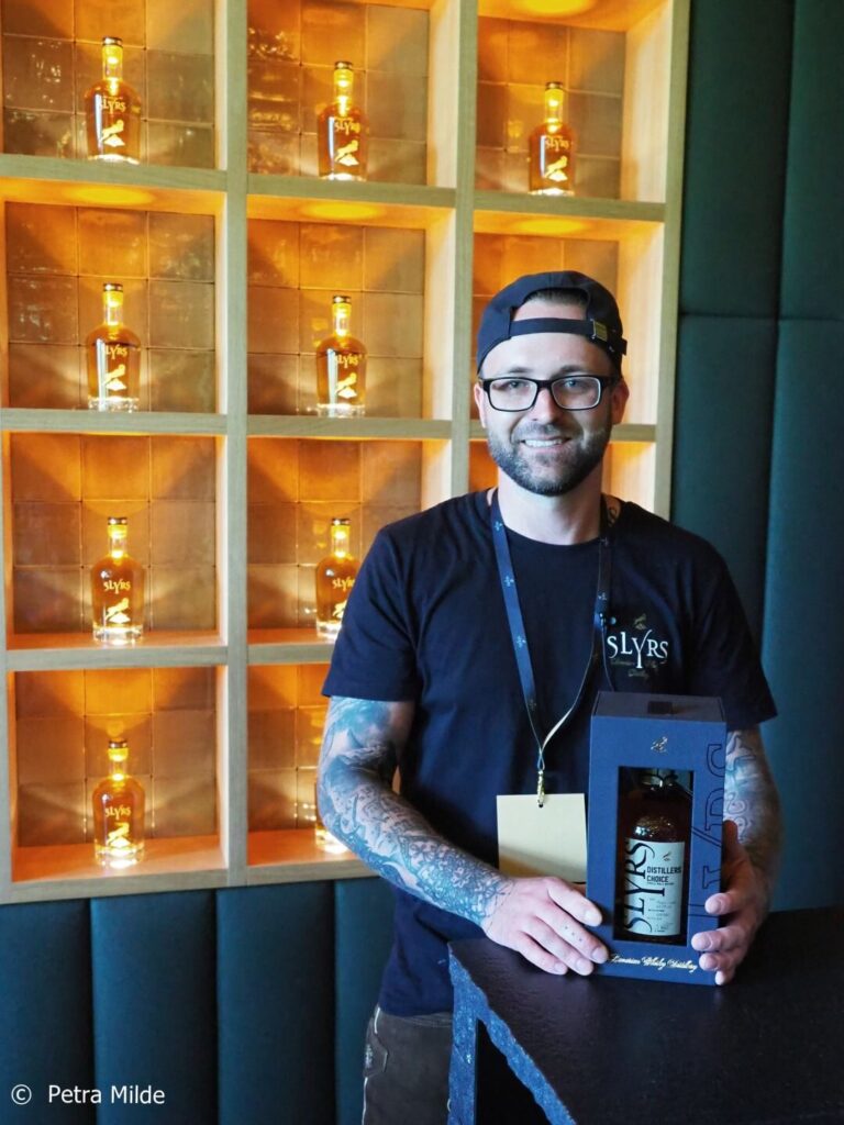 Dass keine Frage unbeantwortet blieb, dafür sorgten die Mitarbeiter und Mitarbeiterinnen von Slyrs, die auf ihren Posten an den Tresen und Theken nicht müde wurden, stolz ihre neue Brennerei und die unterschiedlichen Whiskyabfüllungen zu erklären. Andere mischten sich unter die Gäste, jederzeit offen für Gespräche und Fragen. Hans Kemenater habe ich entdeckt, Geschäftsführer und Master Distiller, ebenso Steffen Brand, Co-Geschäftsführer für Sales & Marketing, Helmut Knöpfle, Head of Brand Experience, Kilian Jonscher, Destillateur und Brand Ambassador, Destillateur Silas Fischer und viele mehr. Letzterer stellte übrigens die neue Distillers Choice Triple Cask Abfüllung vor, für die er die Fässer auswählte.