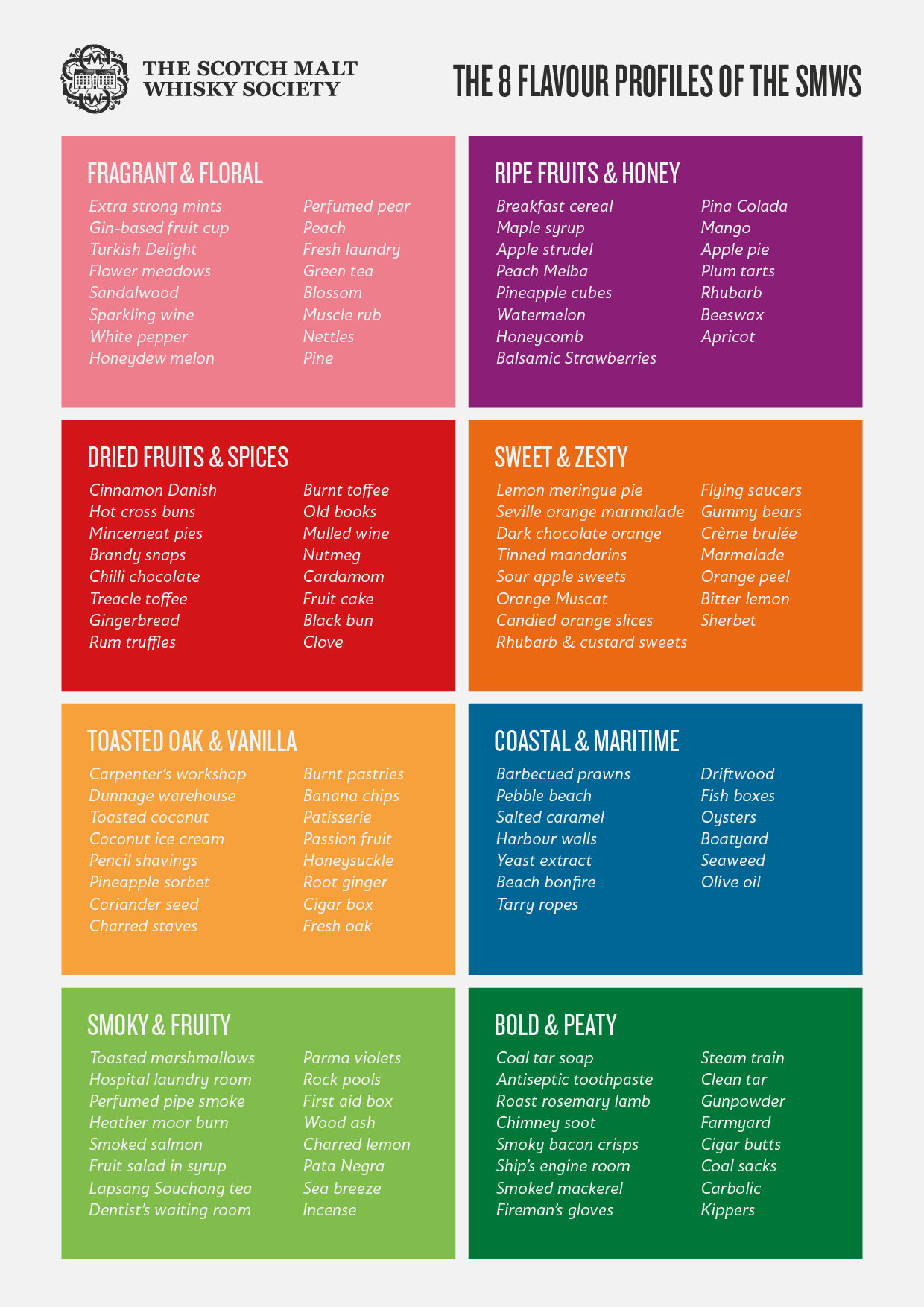 The eight colour-coded categories, which represent the full spectrum of flavours from ‘Fragrant & Floral’ to ‘Bold & Peaty’, are also more closely aligned with the Scotch Whisky Research Institute Flavour Wheel.