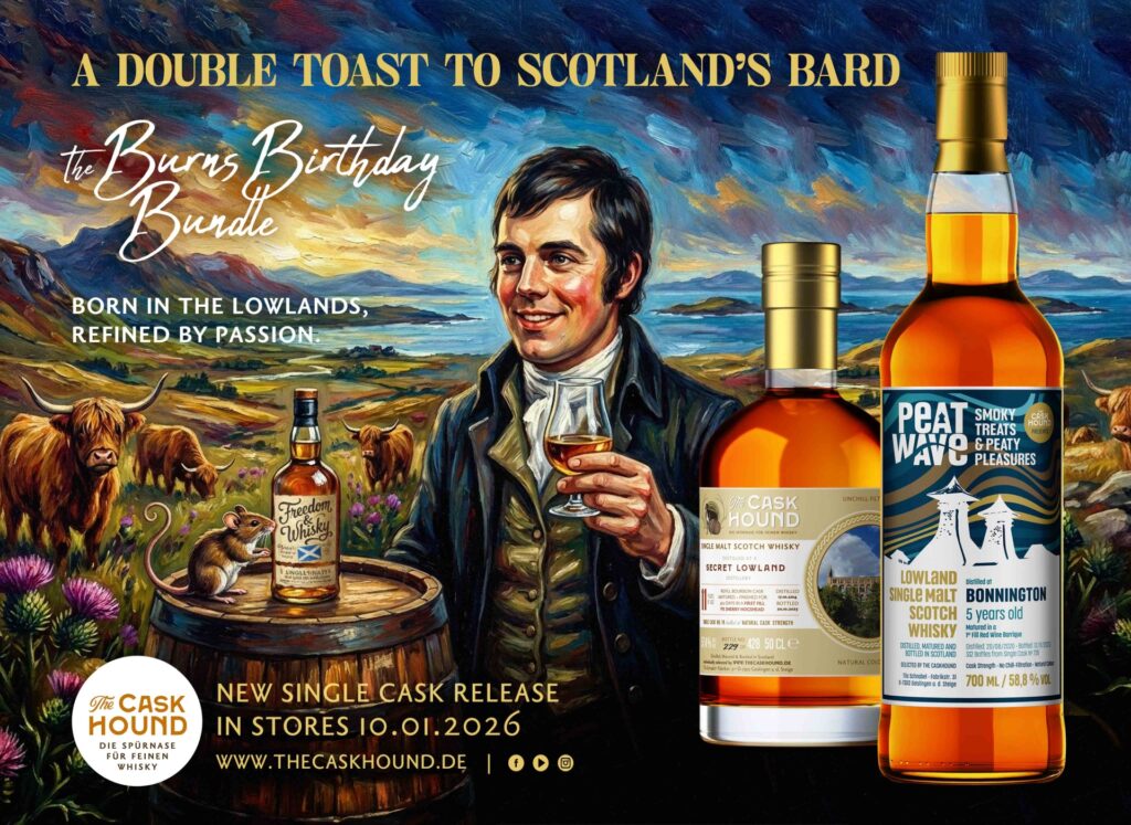 THE CASKHOUND-Mastermind Tilo Schnabel präsentiert anlässlich des 267. Geburtstags von Schottlands Nationaldichter Robert Burns am 25. Januar ein (fass-)starkes Double Release. Seit jeher zelebrieren Schottland-, Burns- und Whiskyfans weltweit den Ehrentag des Barden mit Burns‘ Gedichten, Haggis, Musik – und natürlich einem guten Glas Whisky. Passend dazu wählte Tilo zwei besondere Lowland Single Malts für sein BURNS BIRTHDAY BUNDLE aus – stammte Burns doch aus Ayrshire in den westlichen Lowlands …