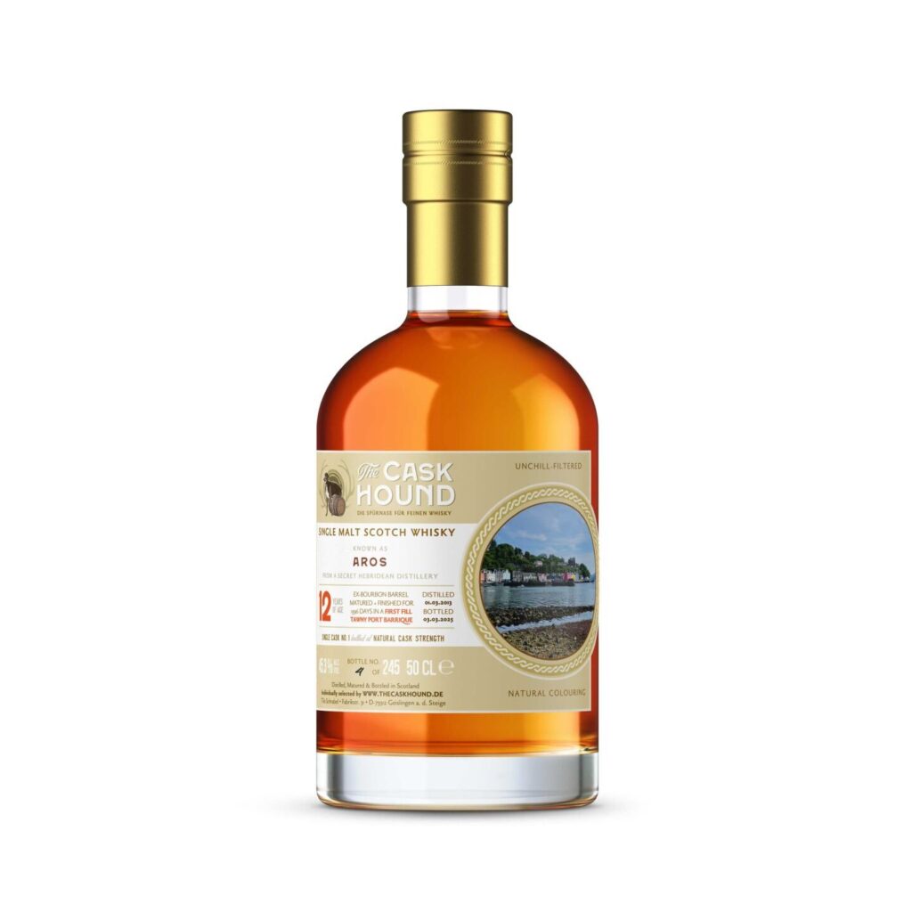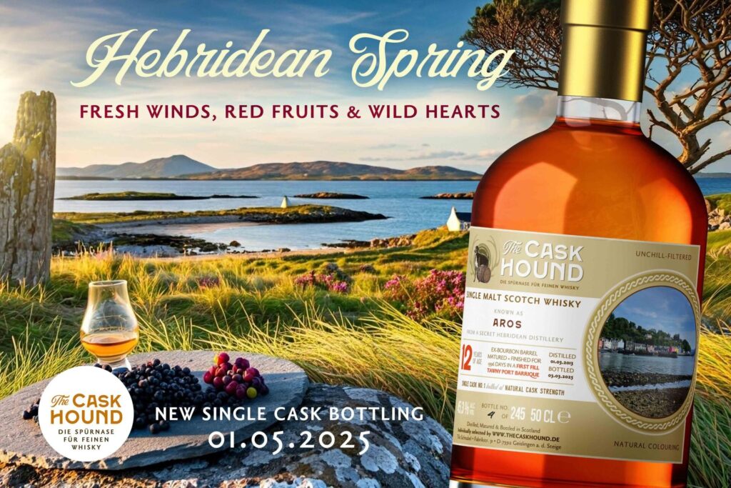 Mit seiner neuesten Abfüllung bringt Tilo Schnabel aka THE CASKHOUND fruchtig-frischen Frühlingswind in die Gläser: AROS, ein 12 Jahre alter Single Malt von den Hebriden, ungetorft, aber voller Charakter. Von welcher Brennerei er stammt? Das bleibt offiziell geheim – doch wer Schottland kennt, weiß beim Namen und beim Blick aufs Etikett schnell Bescheid. Schließlich liegt der Küstenstreifen „Aros“ auf der Isle of Mull – nur einen Steinwurf südlich von Tobermory, dessen bunte Häuserzeile dezent das Label ziert …