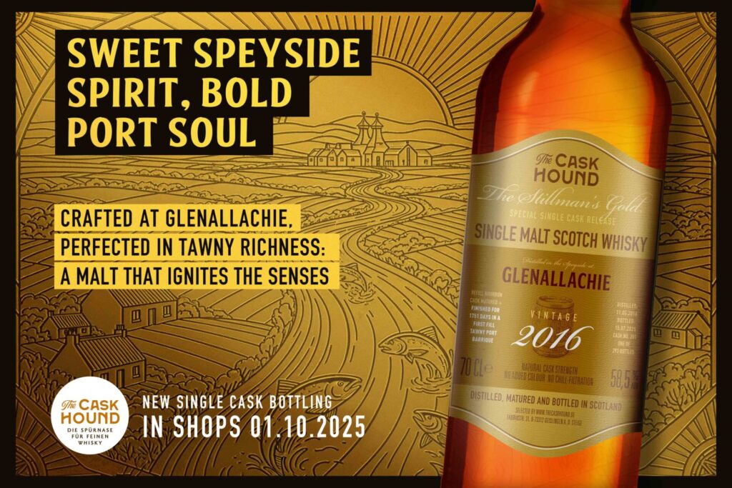 Der Oktober wird golden – nicht nur draußen, sondern auch im Glas! THE CASKHOUND präsentiert ein neues Highlight seiner Reihe THE STILLMAN’S GOLD: einen 9 Jahre GLENALLACHIE, der nach seiner Reifung im Ex-Bourbon-Fass eine über 4 Jahre dauernde Nachreifung im First Fill Tawny Port Barrique spendiert bekam. Ein Malt, der mit Verve süßen Speyside-Charme mit der kräftigen Seele des Ports verbindet – und dabei ein fruchtig-würziges Herbstfeuer entfacht!