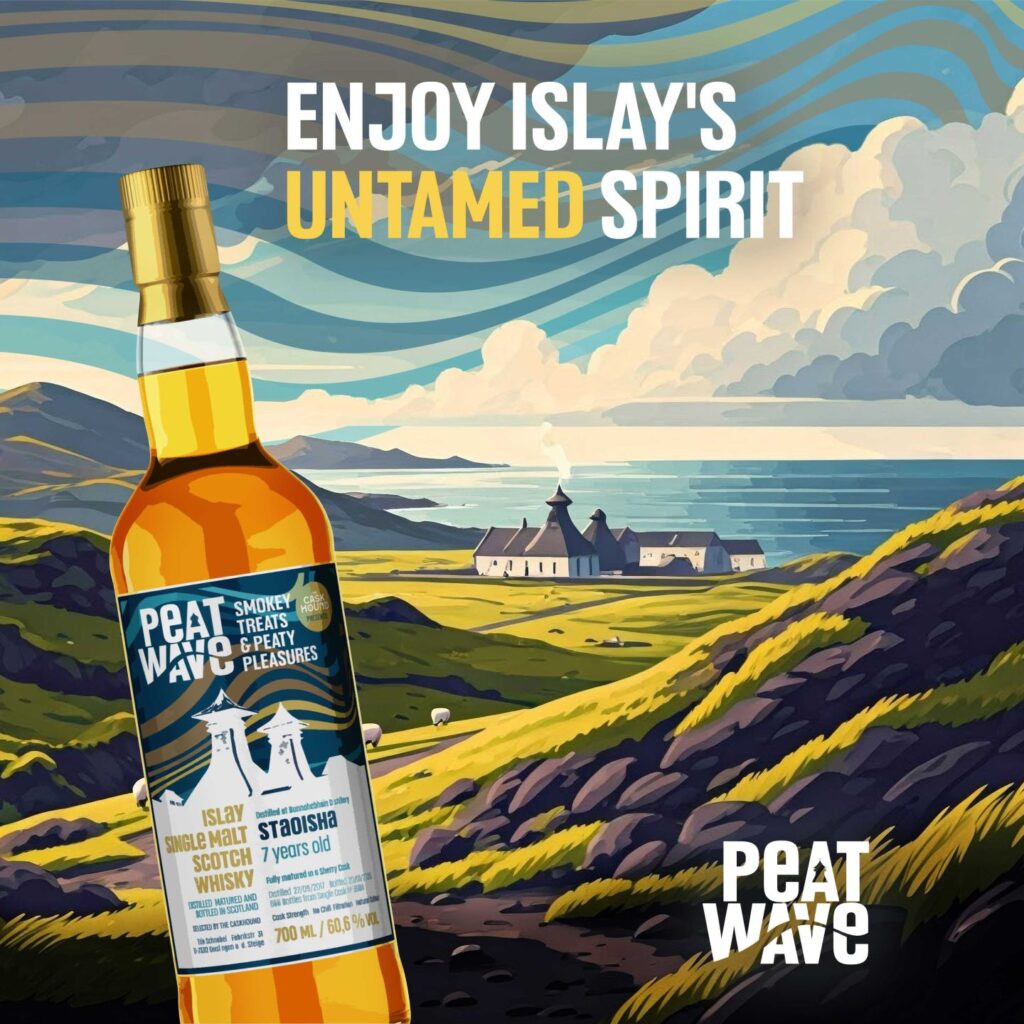 Die PEATWAVE-Abfüllungen von THE CASKHOND wollen die volle Bandbreite rauchig-torfiger Whiskys erfahrbar machen – da dürfen natürlich auch Tropfen von Schottlands legendärer Whisky-Insel nicht fehlen! Für das neunte Kapitel fiel die Wahl auf ein Fass der legendären Bunnahabhain Brennerei, genauer gesagt auf einen ihrer stark getorften Single Malts mit der Bezeichnung STAOISHA. Mit einem Phenolgehalt von bis zu 70 PPM und seinem ungezähmten Charakter ist er ein Liebling unter Peatheads und Islay-Fans.
