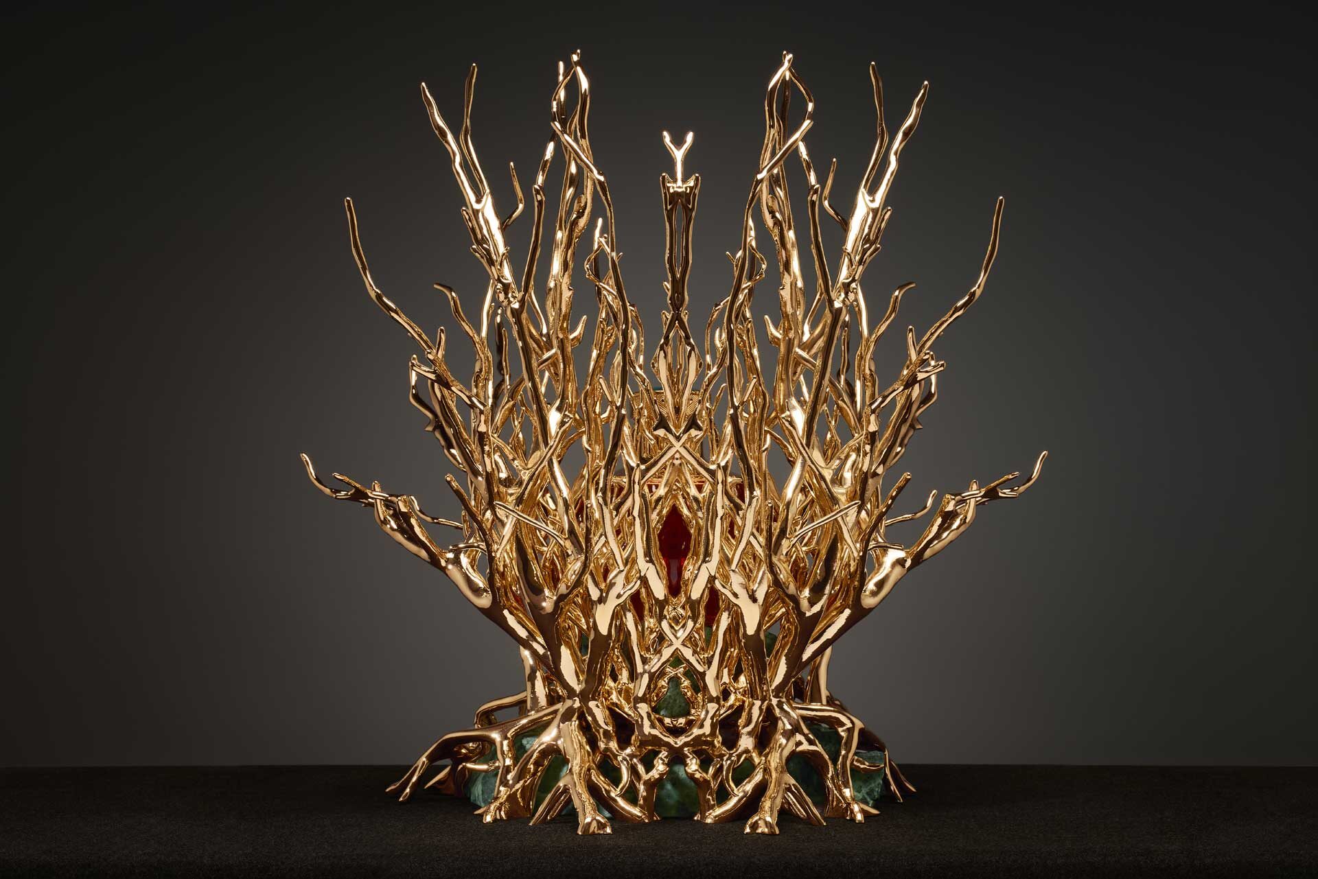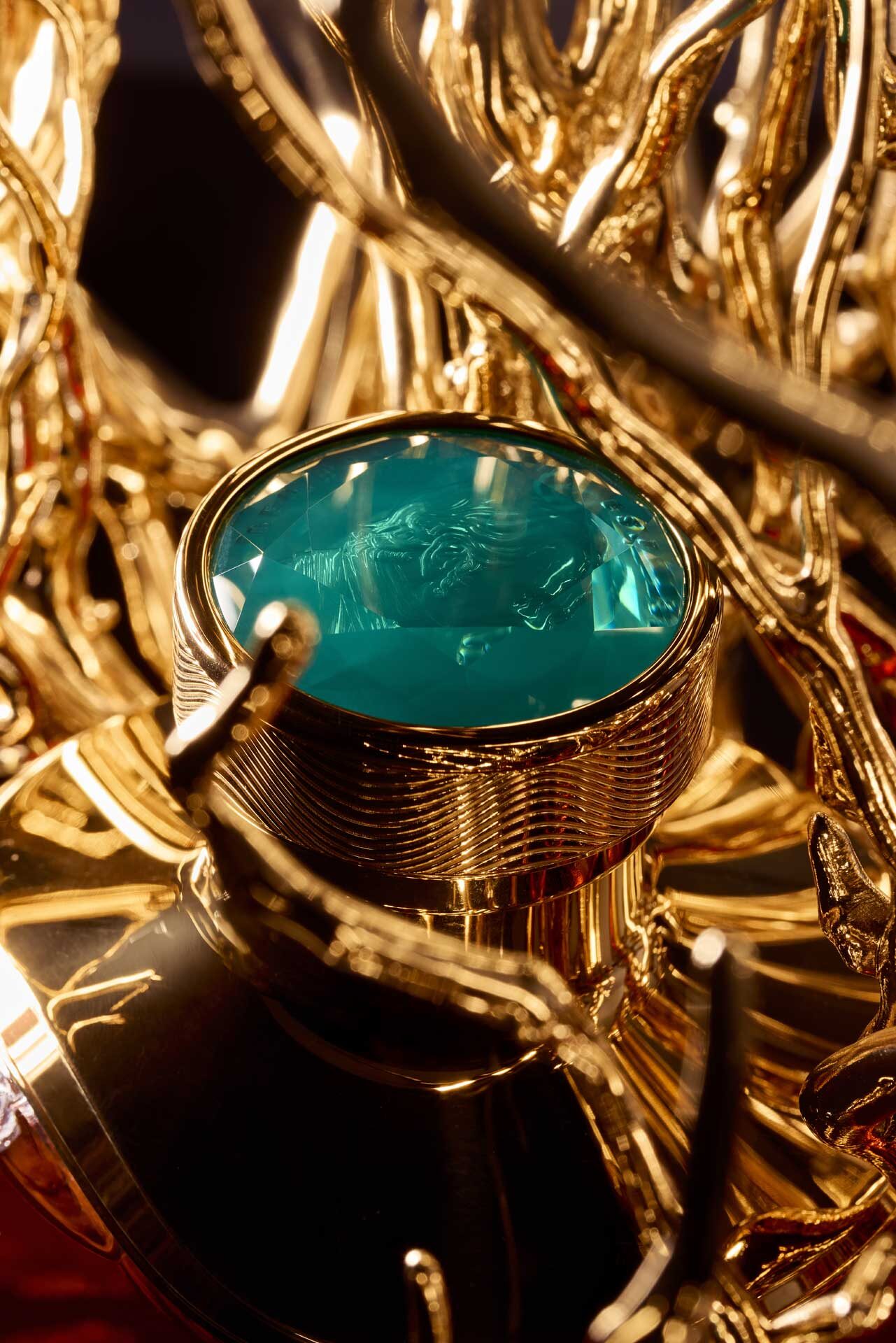 The innovative sculpture design is inspired by the rugged beauty of Speyside, The Glenlivet’s home. A testament to the whisky’s complexity and the dramatic elegance of the Scottish landscape, it powerfully depicts scorched, raw heather branches. The precious single malt is then preserved within a spherical glass decanter, carefully enthroned upon a patinated brass-plated base in the form of a ‘cairn’. This represents the chimney shaped stacks of rocks originally left before battle by ancient Highland clans as a memorial to fellow warriors and the passing of time. The decanter is finished with a 24k gold plated neck and cap, which is further embellished with a layer of coloured faceted glass in The Glenlivet’s emblematic teal on the bottle closure.