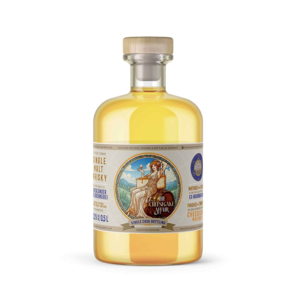 Der Whisky stammt aus der Sauerländer Edelbrennerei und reifte über vier Jahre in einem erstbefüllten Ex-Bourbon-Fass – eine klassisch-solide Grundlage voller Kraft und Tiefe. Seinen verführerischen Twist bekam der Tropfen durch ein 7-monatiges Finish in einem Eichenfass, das zuvor ein aromatisches Cheesecake-Mazerat enthielt. Dies verleiht THE CHEESECAKE AFFAIR einen besonders warmen, sinnlichen Charakter: feine Anklänge von Vanille, Gebäck, cremige Noten und sanfte Süße treffen auf die kräftig malzige Struktur des Malts. Eine äußerst aromatische Affäre, der man gerne verfällt. Abgefüllt mit kräftigen, aber gut integrierten 62,2 % Vol. und auf nur 48 Flaschen limitiert, ist der Dram extrem süffig, charmant, frech – ein Whisky, der nicht nur schmeckt, sondern Spaß macht!
