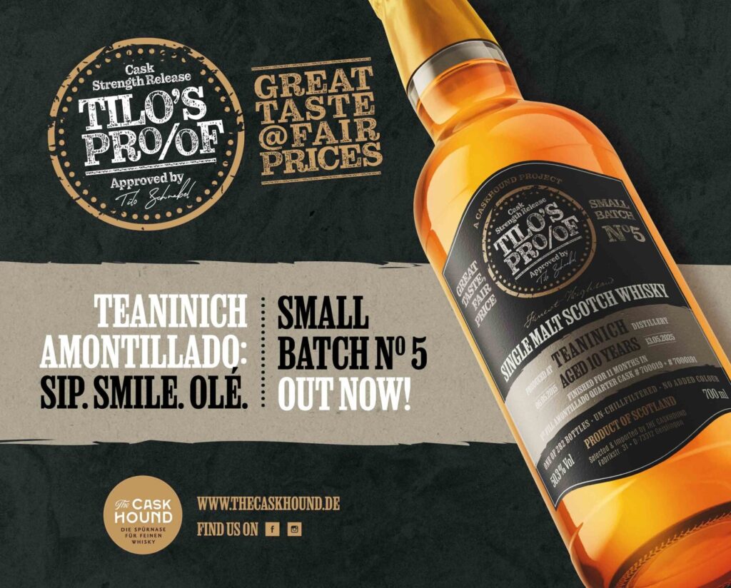 Der TEANINICH wird – wie alle Abfüllungen von TILO’S PROOF – in Batch Strength, ungefärbt und nicht kühlfiltriert angeboten. Ab Dienstag, dem 1. Juli 2025, ist dieser Highland Malt in unserem Shop sowie bei unseren Handelspartnern erhältlich..
