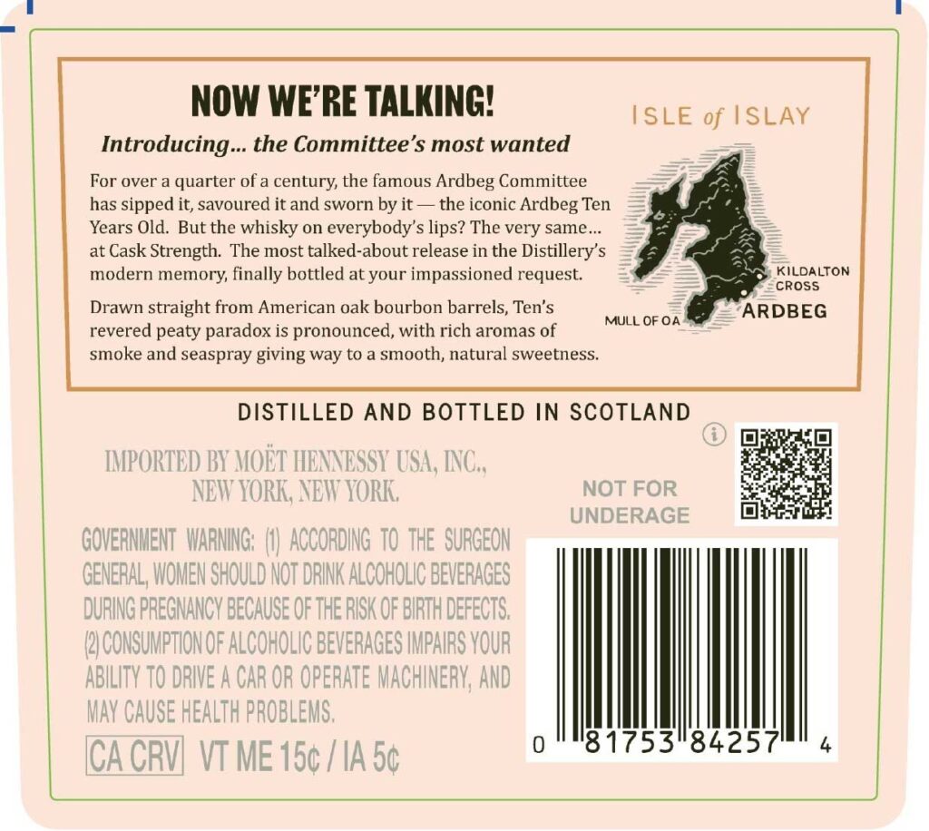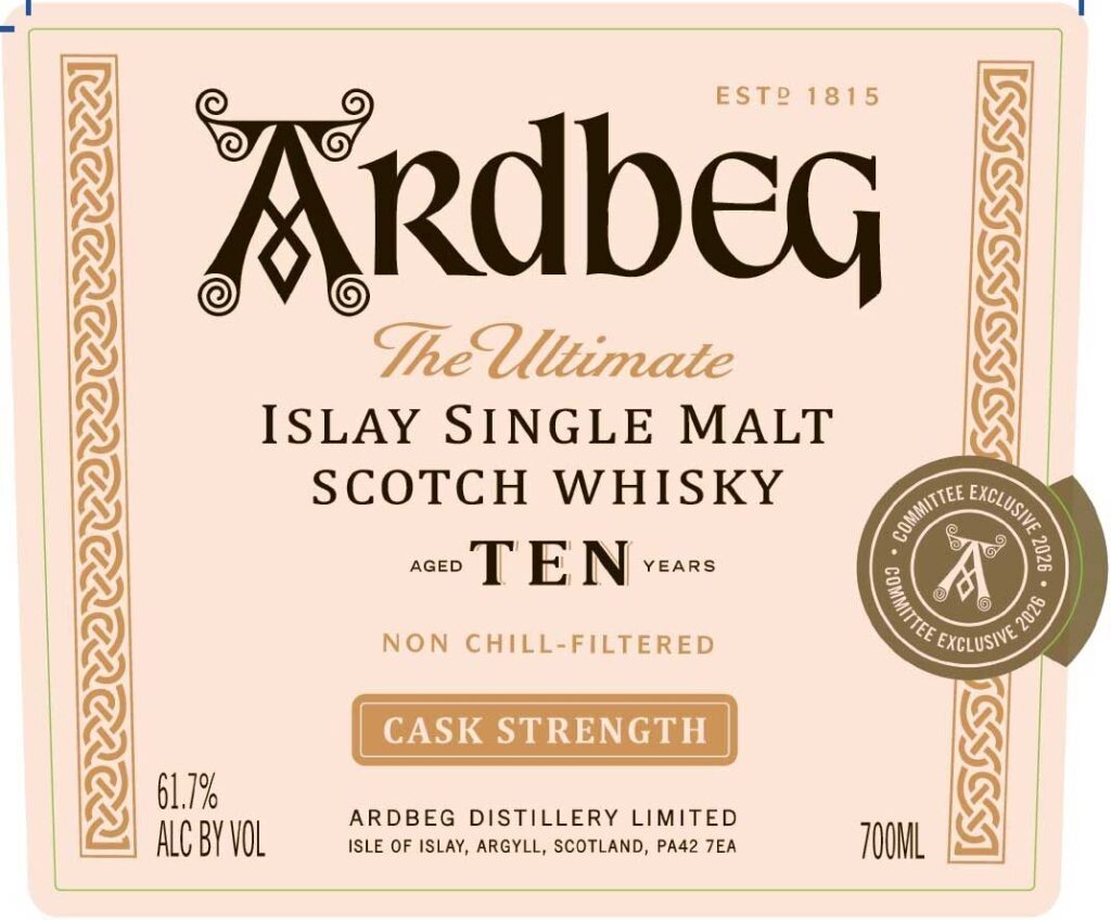 Eine spannende sich ankündigende Abfüllung können wir zum Start der neuen Woche Ihnen mal wieder präsentieren. Denn in der us-amerikanischen TTB-Datenbank sind die Label der Ardbeg Committee Exclusive 2026 Abfüllung aufgetaucht. Der Klassiker aus dem Portfolio der Islay-Brennerei, Ardbeg Ten, wird in Fassstärke erscheinen, und als Ardbeg Ten Cask Strength für die Mitglieder des Ardbeg Committees erhältlich sein. Mit 61,7 % Vol. und ohne Kühlfiltrierung wird der Malt in die Flaschen kommen, deren Label so aussehen: