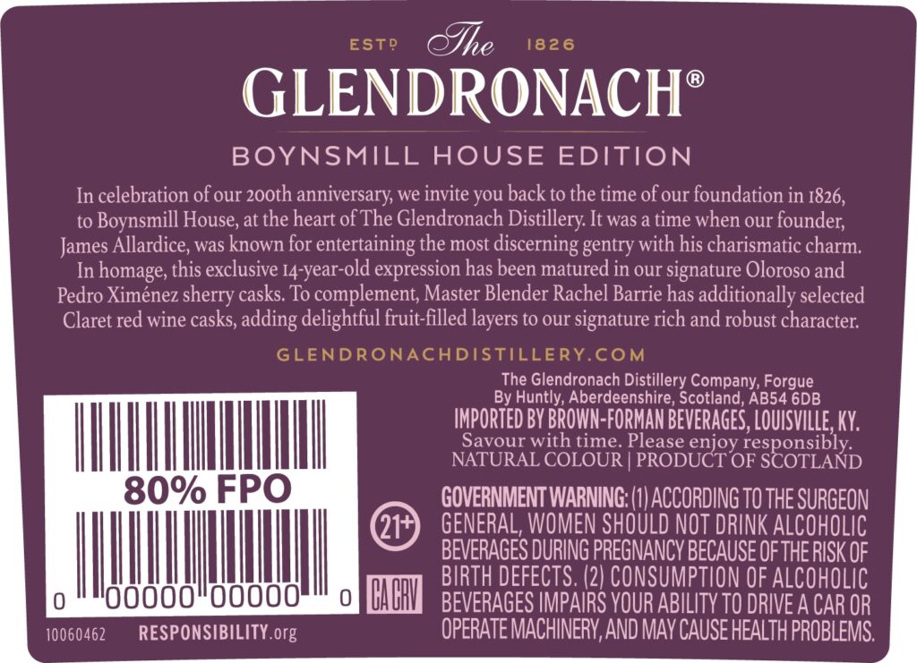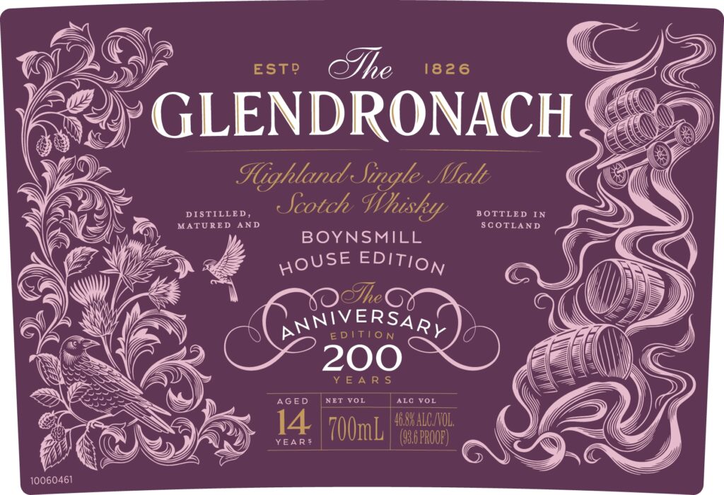Etwas länger gibt es bereits die Destillerie Glendronach, die ihren 200. Geburtstag feiert. Anlässlich dieses Jubiläums legt man dort den Glendronach 14yo Boynsmill House Edition auf, der nach dem Gebäude benannt ist, das 1826 das Herz der Destillerie bildete. Master Blender Rachel Barrie hat zu den typischen Oloroso- und PX-Fässern noch Claret Rotweinfässer geblendet, um damit die Fruchtigkeit des Whiskys noch zu heben. Abgefüllt ist er mit 46,8% vol. Alkoholstärke – und so sehen die Etiketten aus: