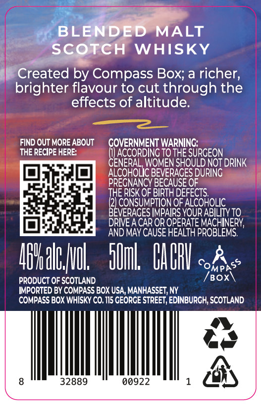 Ein neuer Eintrag in der us-amerikanischen Datenbank deutet darauf hin, dass man sich bei Compass Box Gedanken über diesen Umstand gemacht hat und mit Compass Box Cabin Proof einen Blended Malt kreierte, der durch seinen „gehaltvolleren und helleren“ Geschmack den Effekten der Höhe entgegenwirkt. Abgefüllt ist er mit 46%, und es ist vorstellbar, dass er vor allem über Fluglinien angeboten wird (aber das ist hier rein spekulativ).