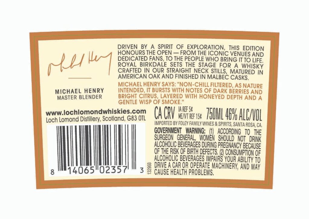 Bis zum 154th Open in Southport ist es zwar noch etwas hin (es findet vom 12. bis 19. Juli statt), aber Loch Lomond als offizieller Whisky des Open hat natürlich jetzt schon die Abfüllung dafür in petto. Der Eintrag in der us-amerikanischen TTB-Datenbank zeigt uns eine von Master Blender Michael Henry kreierte den Loch Lomond 154th Royal Birkdale Open Special Edition mit Spirit aus den geradehalsigen Stills bei Loch Lomond und einem Finish in argentinischen Malbec-Fässer, in die Flasche wird sie mit 46% vol. Alkoholstärke.
