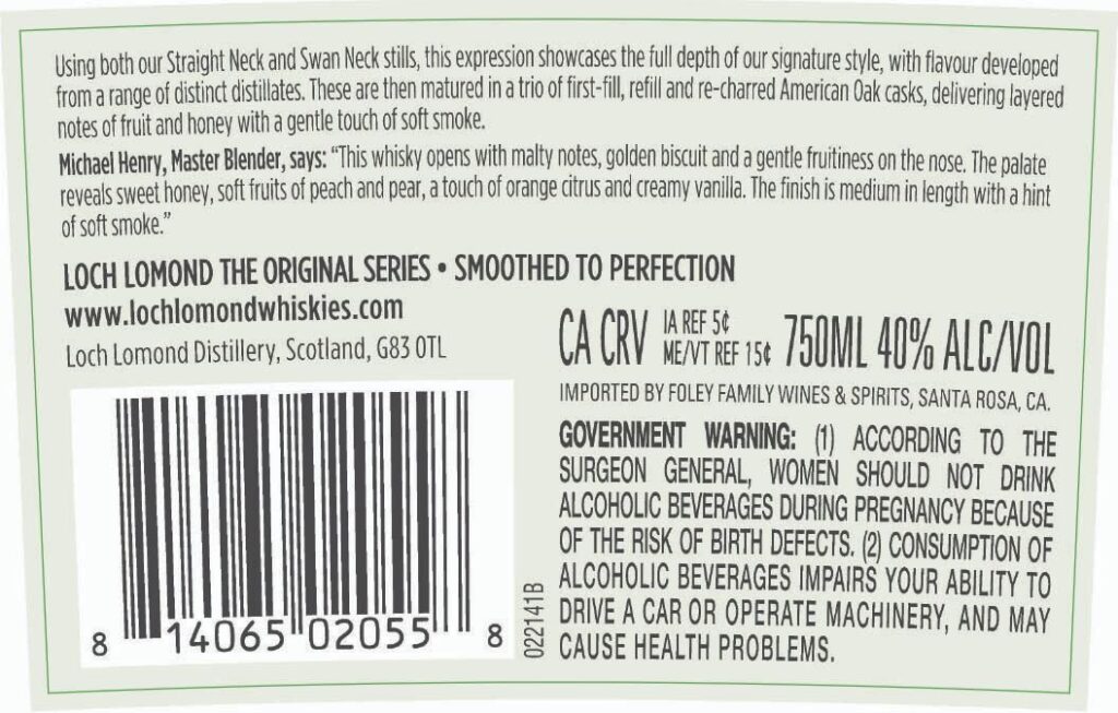 Dabei ist die vor allem die Rückseite interessant, denn auf ihr wird erklärt, was das „Triple Oak“ zu bedeuten hat: Nach der Destillation in den Stills mit geraden Hälsen und jenen mit Schwanenhälsen kommen sie in first fill, refill und recharred Fässer aus amerikanischer Eiche, um dort zu reifen. Der Loch Lomond The Original Triple Oak entwickelt in ihnen Noten von Früchten, Honig und zeigt auch sanfte Rauchnoten.