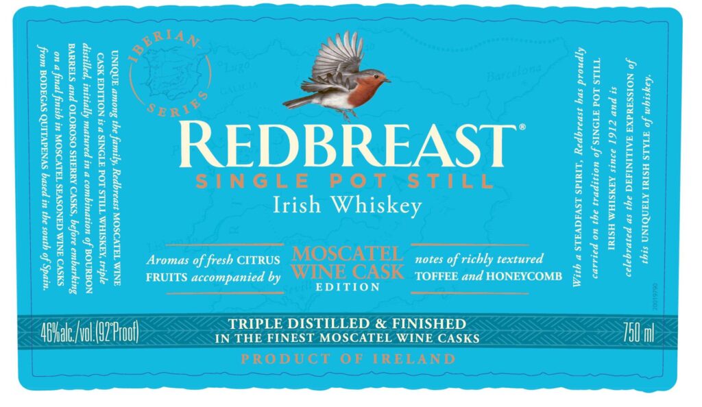 „Unique among the family, Redbreast Moscatel Wine Cask Edition is a Single Pot Still Whiskey, triple distilled, initially matured in a combination of Bourbon Barrels and Oloroso Sherry Casks, before embarking on a final finish in Moscatel Seasoned Wine Casks from Bodegas Quitapenas based in the south of Spain.“