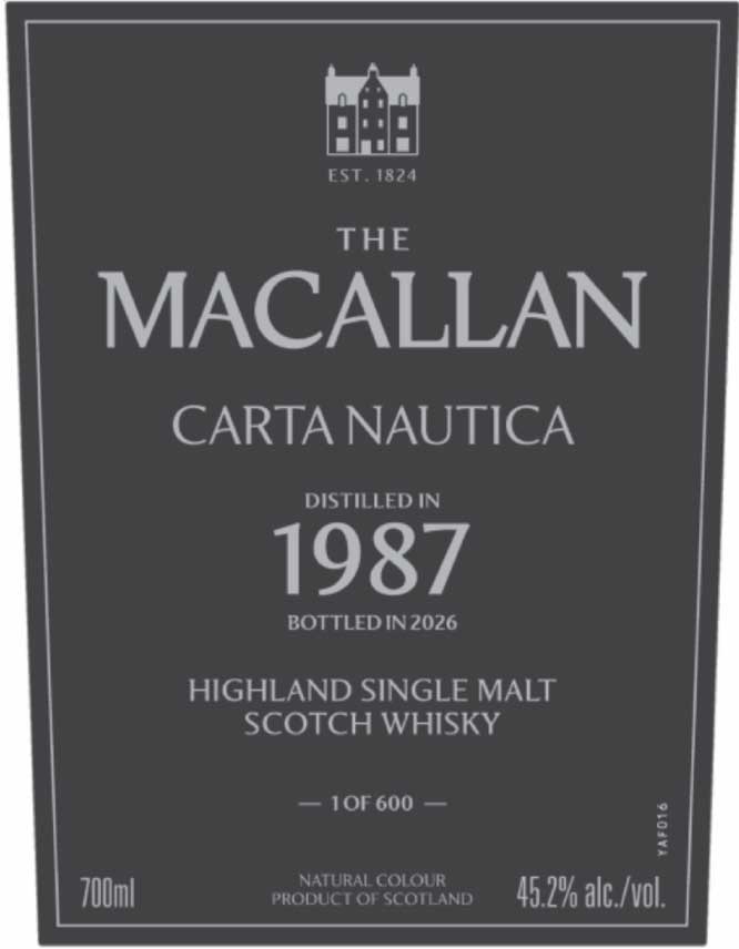 Der Malt der Speyside-Brennerei wurde 1987 destilliert, und kam (oder kommt noch) in diesem Jahr mit einem Alkoholgehalt von 45,2 % Vol. in die 600 verfügbaren Flasche. Hier die The Macallan Carta Nautica 1987 Label: