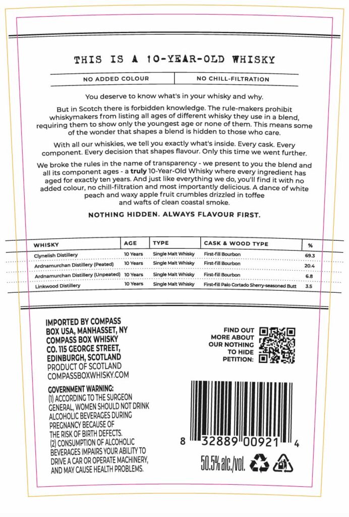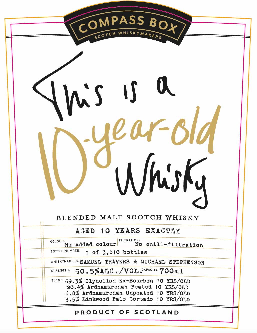 Ohne Färbung und ohne Kühlfiltration kommt Compass Box This is a 10-year-old Whisky mit 50,5 % Vol. in die 3.610 erhältlichen Flaschen, die diese Label tragen sollen: