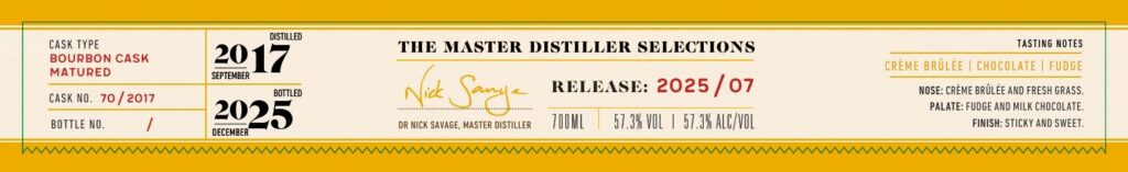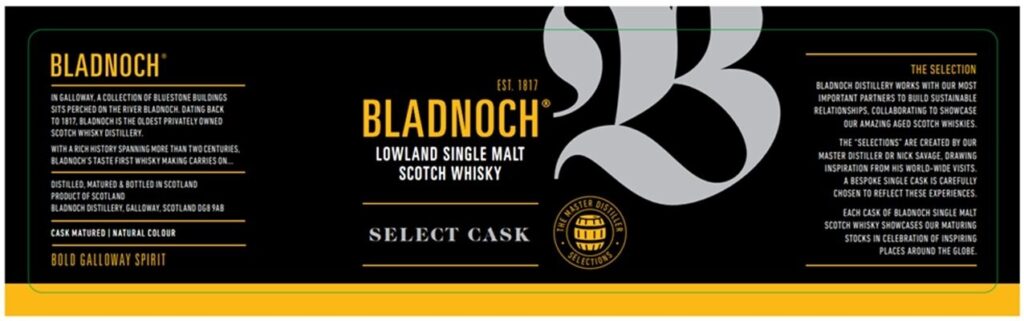 Beim Bladnoch The Master Distiller Selection 2025/07 bleibt einmal abzuwarten, welcher Markt diese Einzelfassabfüllung aus der Destillerie bekommen wird. Am Label sind sowohl die US-Angabe für den Alkohol als auch die in Europa gebräuchlichere Form angegeben, das Bottling selbst ist mit 700ml abgefüllt (in beiden Regionen zum Verkauf zugelassen. Der Whisky wurde 2017 im September destilliert und wird im Dezember 2025 abgefüllt werden, mit 57,3% vol. Alkoholstärke. Er stammt aus einem Bourbonfass und die Etiketten präsentieren sich wie folgt: