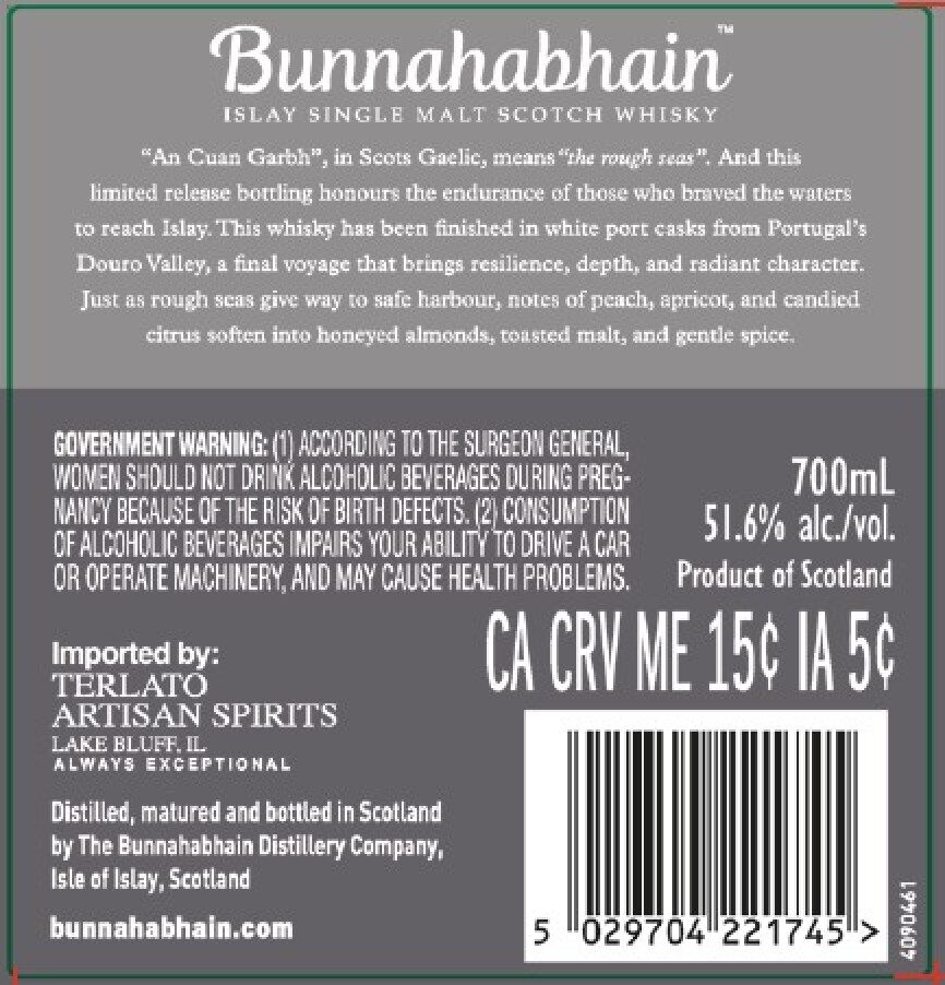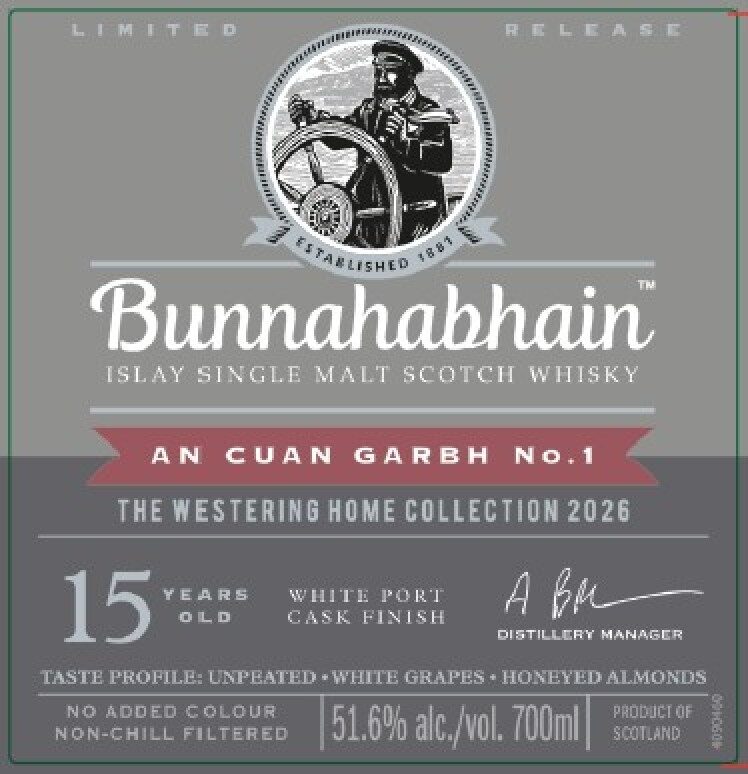 Der Bunnahabhain An Cuan Garbh No.1 wurde in einem White Port Cask gefinish und ist ungetorft. Weiße Trauben und in Honig getunnkte Mandeln sollen seinen Geschmack bestimmen. Abgefüllt ist der Whisky mit 51,6% vol. Alkoholstärke, und so sehen die Etiketten aus: