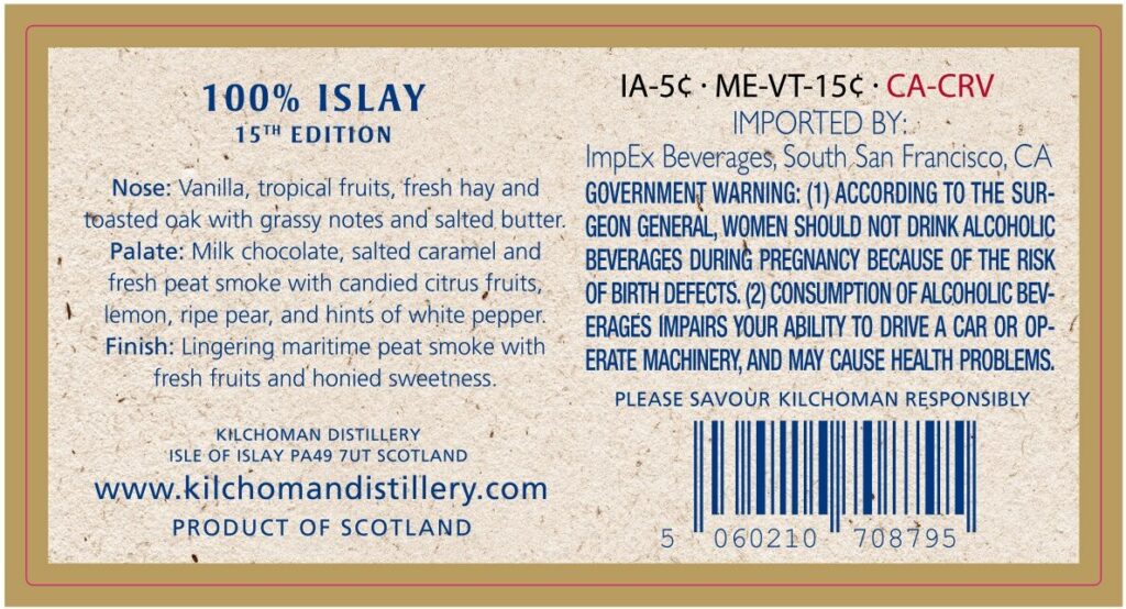 Dann werden in absehbarer Zeit zwei neue Kilchoman bei den Händlern zu finden sein. Der erste davon ist die 15. Ausgabe des Kilchoman 100% Islay, bei dem alle Komponenten des Whiskys, von Gerste über Wasser bis Torf von Islay stammen. Die Tasting Notes versprechen in der Nase Vanille, tropische Früchte, frisches Heu und geröstete Eiche mit grasigen Noten und gesalzener Butter, am Gaumen dann Milchschokolade, gesalzenes Karamell und frischer Torfrauch mit kandierten Zitrusfrüchten, Zitrone, reifer Birne und einem Hauch von weißem Pfeffer. Im langen Finish sollen maritimer Torfrauch mit frischen Früchten und honigsüßen Noten zu finden sein. Hier die Etiketten:
