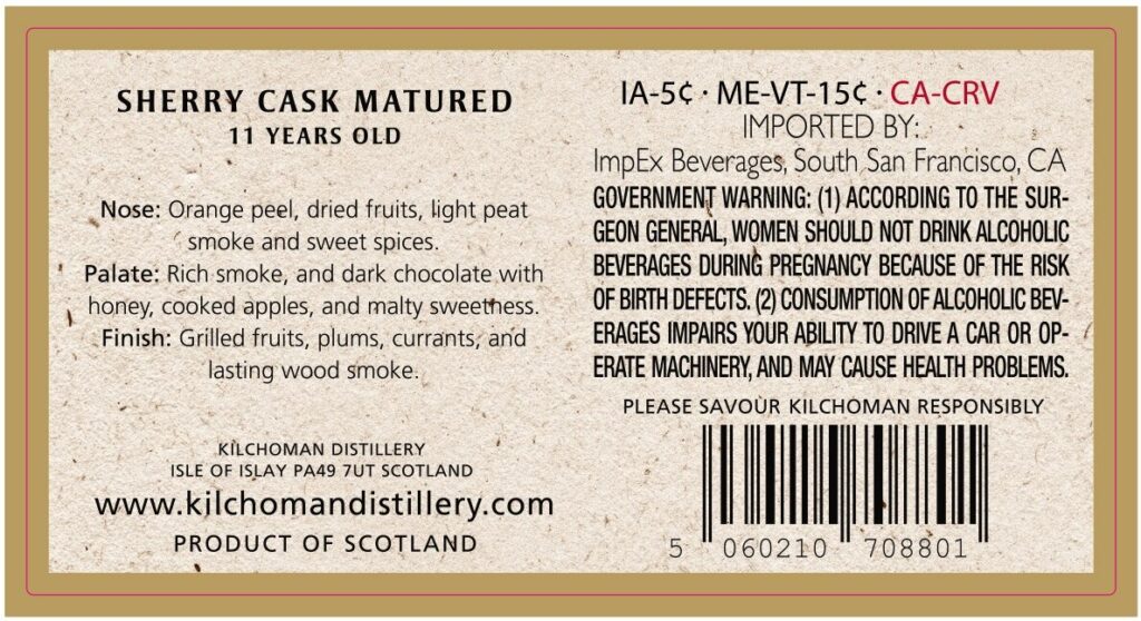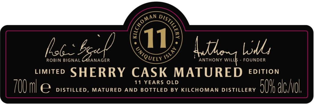 Und dann gibt es noch den Kilchoman Sherry Cask Matured, der – wie der Name schon sagt – ausschließlich in Sherryfässern gereift wurde. Er ist 11 Jahre alt, und seine Tasting Notes versprechen ein recht vielschichtiges Geschmackserlebnis: in der Nase Orangenschale, getrocknete Früchte, leichter Torfrauch und süße Gewürze. am Gaumen kräftiger Rauch und dunkle Schokolade mit Honig, gekochten Äpfeln und malziger Süße, im Finish schließlich dann gegrillte Pflaumen, Johannisbeeren und anhaltender Holzrauch. Auch hier wieder die Etiketten für Sie: