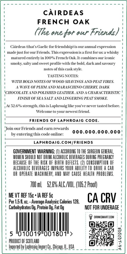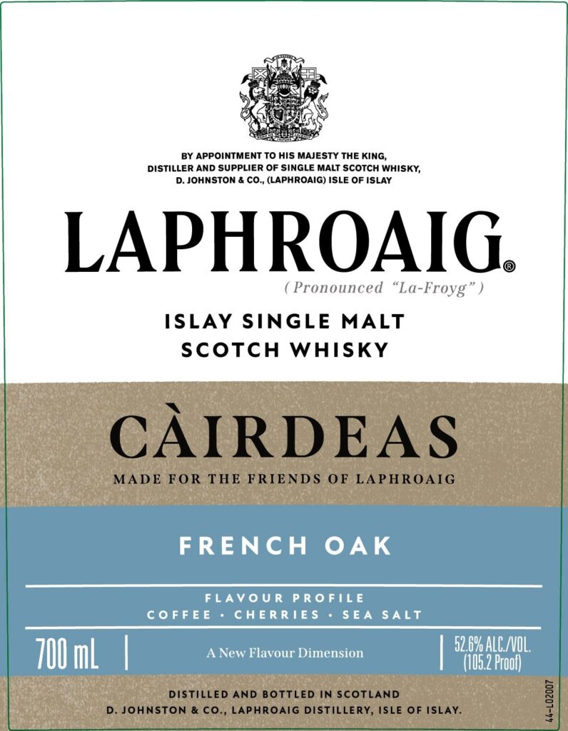 Neues aus der us-amerikanischen TTB-Datenbank, und zwar aus den Highlands und von Islay. Beginnen wir gleich einmal dort: Jetzt sind die Label des neuen Laphroaig Càirdeas French Oak aufgetaucht, abgefüllt mit 52,6% uvol. Alkoholstärke und einem interessanten Geschmacksprofil: Kaffee, Kirschen und Meersalz. Er reifte komplett in Fässern aus französischer Eiche, und die vollen Tasting Notes lesen sich wie folgt: