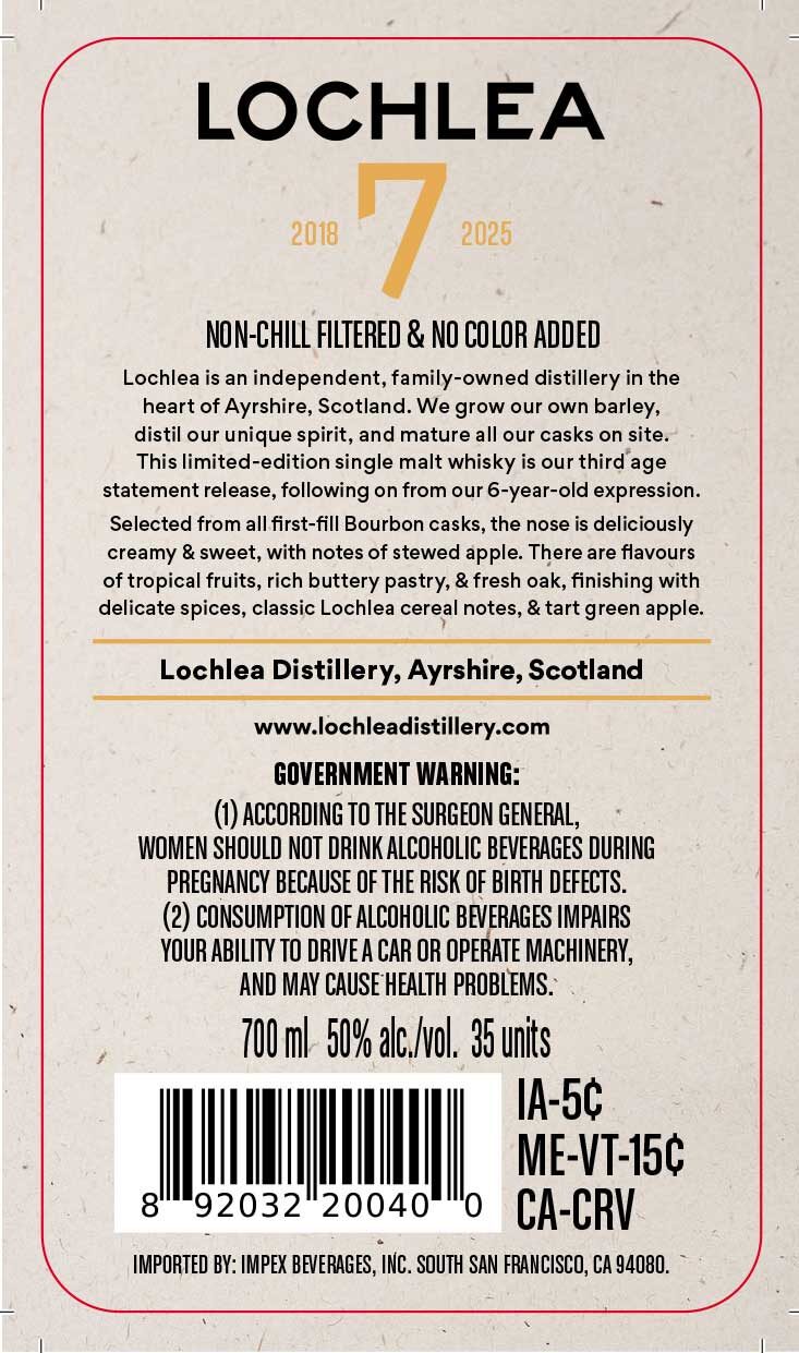 Die in den Lowlands liegende Lochlea Distillery veröffentlichte am 25. Januar 2024 zur Burns Night ihren ersten Whisky mit einer Altersangabe. Auf diesen Lochlea 5 folgte dann genau ein Jahr später Lochlea 6. Und so vermuten wir deshalb, dass Lochlea 7, dessen Label in der TTB-Datenbank auftauchten, als dritter Whisky mit einer Altersangabe dieser Praxis folgend am 25. Januar 2026 erscheinen könnte. Die Etiketten des Malt Whiskys, der in first-fill Bourbon casks reifte, sehen so aus: