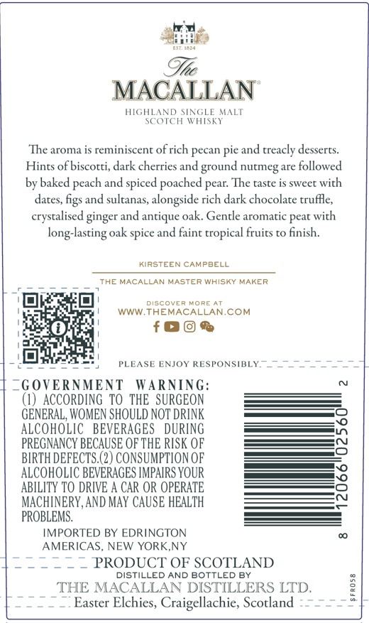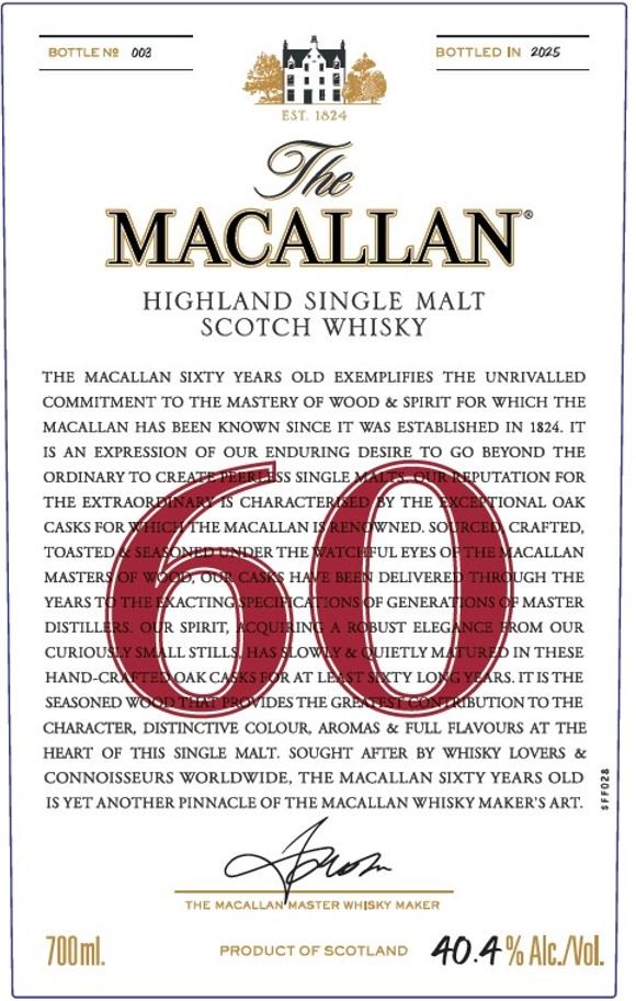 Beginnen wir mit dem Macallan Red 60yo in der Ausgabe für 2025. Dieser ist mit 40,4% vol. Alkoholstärke abgefüllt, also nur knapp über der Marke, unter der ein Whisky nicht mehr als solcher bezeichnet werden darf. Die Tasting Notes finden sich am Rückseitenetikett – mehr Infos sind über ihn derweilen nicht zu erhalten. Hier die Etiketten: