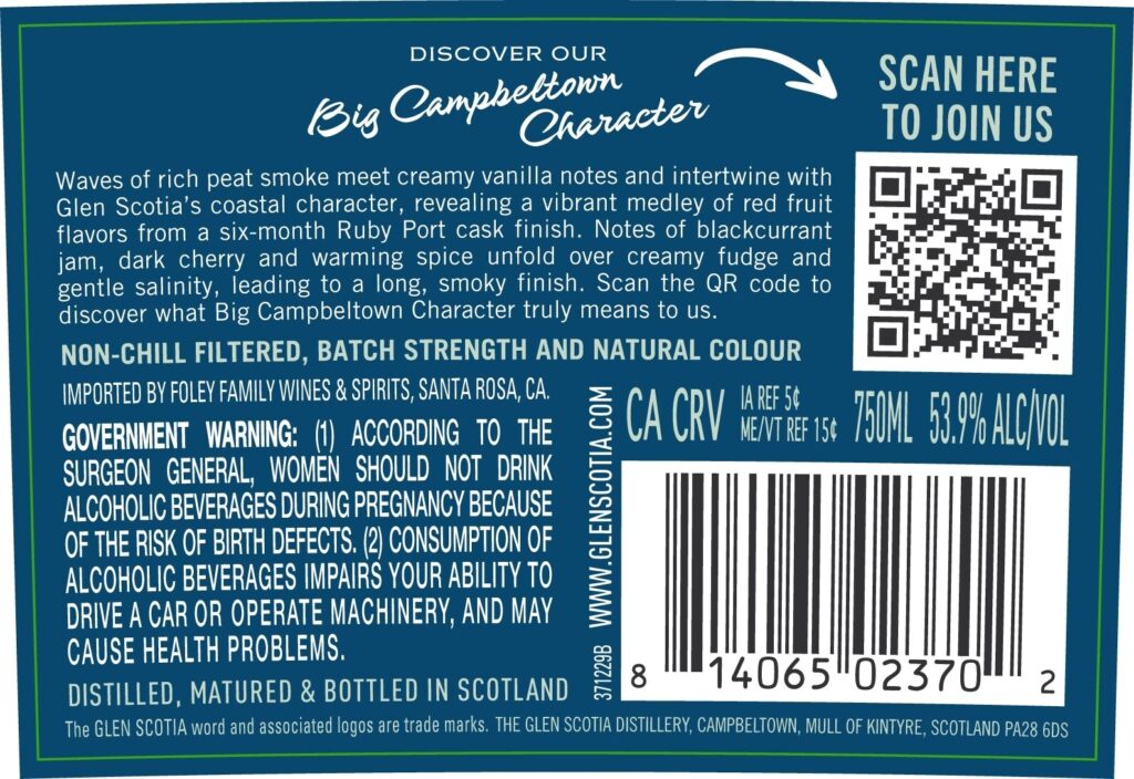 Die Tasting Notes auf der Rückseite versprechen Wellen von reichem Torfrauch, die auf cremige Vanillenoten treffen und sich mit dem küstennahen Charakter von Glen Scotia verbinden. Dabei offenbart sich ein lebendiges Zusammenspiel von roten Fruchtaromen, die aus dem sechsmonatigen Finish in Ruby Port-Fässern stammen. Weiters entfalten sich Noten von Schwarzkirschmarmelade, dunkler Kirsche und wärmenden Gewürzen über cremigem Fudge und einer sanften Salzigkeit, die in einen langen, rauchigen Abgang mündet.