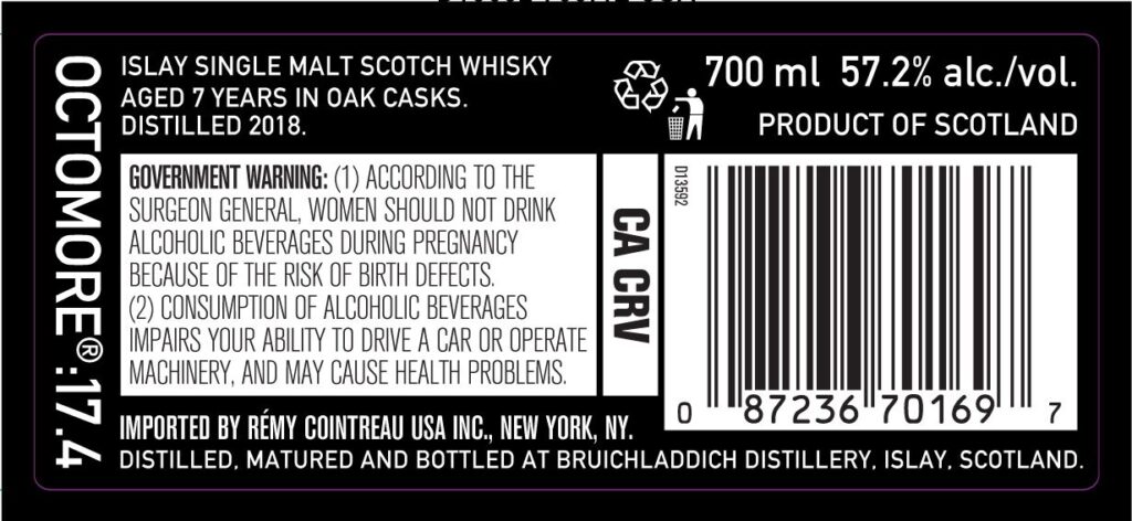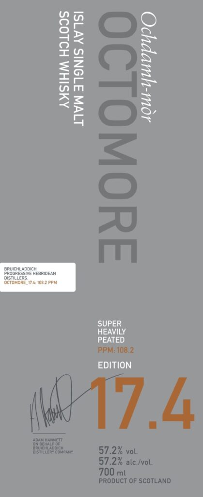 Starten wir diesen Sonntag gleich wieder mit zwei Neuheiten aus der us-amerikanischen TTB-Datenbank: Nachdem wir Ihnen vor geraumer Zeit die Octomore 17.1 bis 17.3 vorstellen durften, die uns 2026 erfreuen werden, ist nun auch das Label für den Octomore 17.4 aufgetaucht. Er wird sieben Jahre alt , in Oloroso-Casks und in French Virgin Oak gereift und mit Concerto Barley vom schottischen Festland gebrannt sein. Abgefüllt wird der mit 108,2ppm getorfte Octomore 17.4 mit 57,2% vol. Alkoholstärke. So sehen die Etiketten aus: