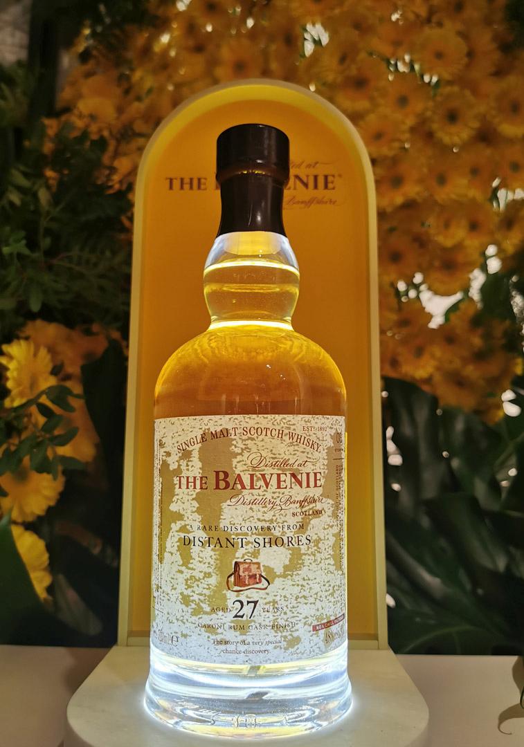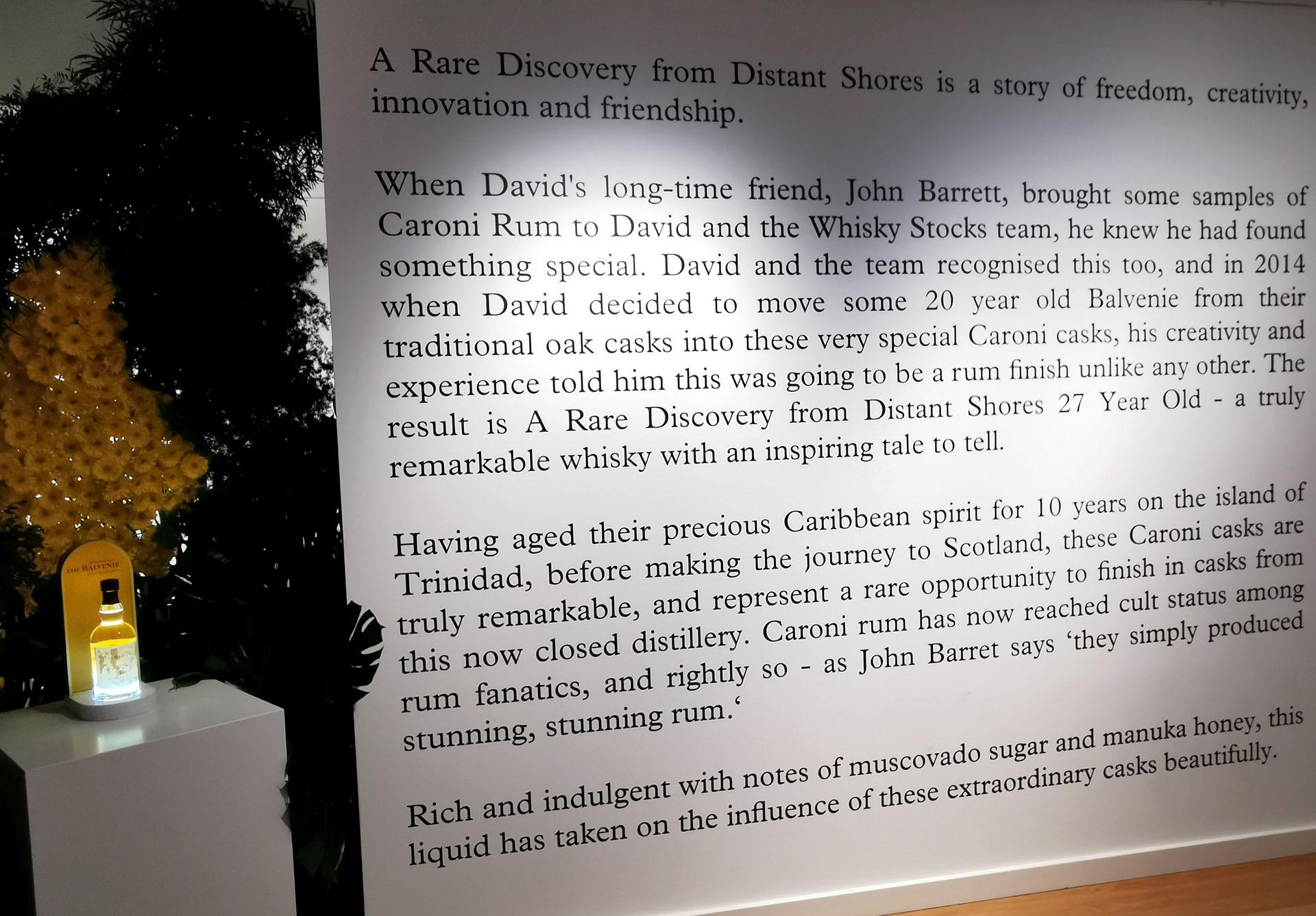 Alle waren sich einig, dass diese Fässer mit The Balvenie sehr gut harmonieren würden. Zunächst war angedacht, einen 14-jährigen The Balvenie als Basis zu verwenden, jedoch wurden diese Fässer für ein Madeira Finish vorgezogen für die spätere Abfüllung eines 21 Years Old. David suchte nach etwas älterem und entschied sich schließlich für einen rund 20 jährigen The Balvenie gereift in „Traditional Oak Casks“, die auf Basis des Geschmacksprofils sehr wahrscheinlich ex-Bourbon Refill Casks waren. Dieser Whisky wurde in die ex-Caroni Fässer von John Barret umgefüllt und durfte weitere sieben Jahre reifen. Das Ergebnis ist eine Fusion aus einem vielschichtigen Scotch Whisky mit dem Rumcharakter von Caroni: der The Balvenie „A Rare Discovery From Distant Shores“ 27 Years Old.
