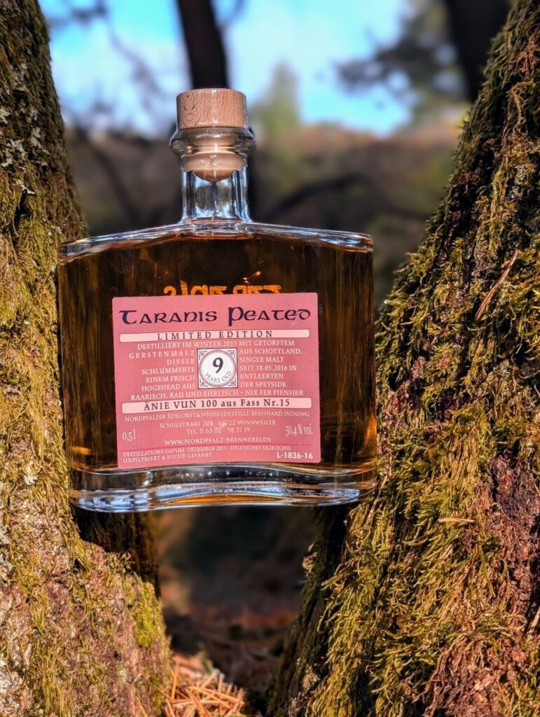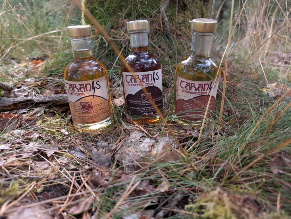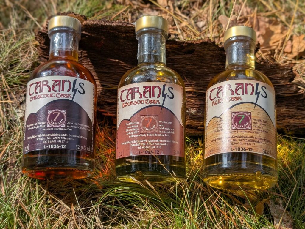 Der 2024 mit der Goldenen Kammerpreismünze des Landes Rheinland-Pfalz ausgezeichnete Taranis Single Malt aus dem Bourbonfass bekommt durch ein im Kastanien- und ein im Rumfass gereiftes Destillat Verstärkung. Alle drei Single Malts sind Einzelfassabfüllungen, jeweils 7 Jahre alt und erweitern das Aromenspektrum der Nordpfälzer Edelobst & Whiskydestille Hönig deutlich.