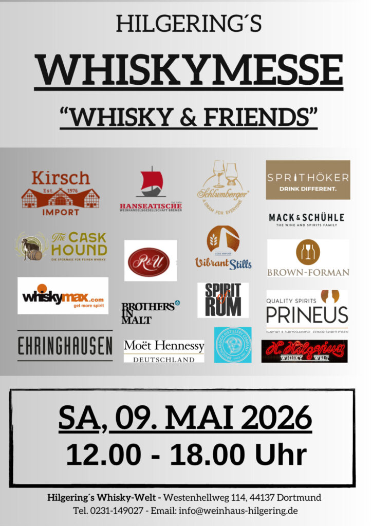 Am 9. Mai zwischen 12 und 18 Uhr findet in der Dortmunder Innenstadt eine „etwas andere Whiskymesse“, wie der Veranstalter, Hilgering´s Whisky-Welt Dortmund, schreibt: Die Whisky & Friends 2026 ist klein im Format, aber mit viel Raum fürs Verkosten, miteinander reden und genießen. Die Aussteller versprechen eine große Bandbreite an interessanten Abfüllungen, zusätzlich gibt es regionale Kornbrände und Rum zu verkosten.
