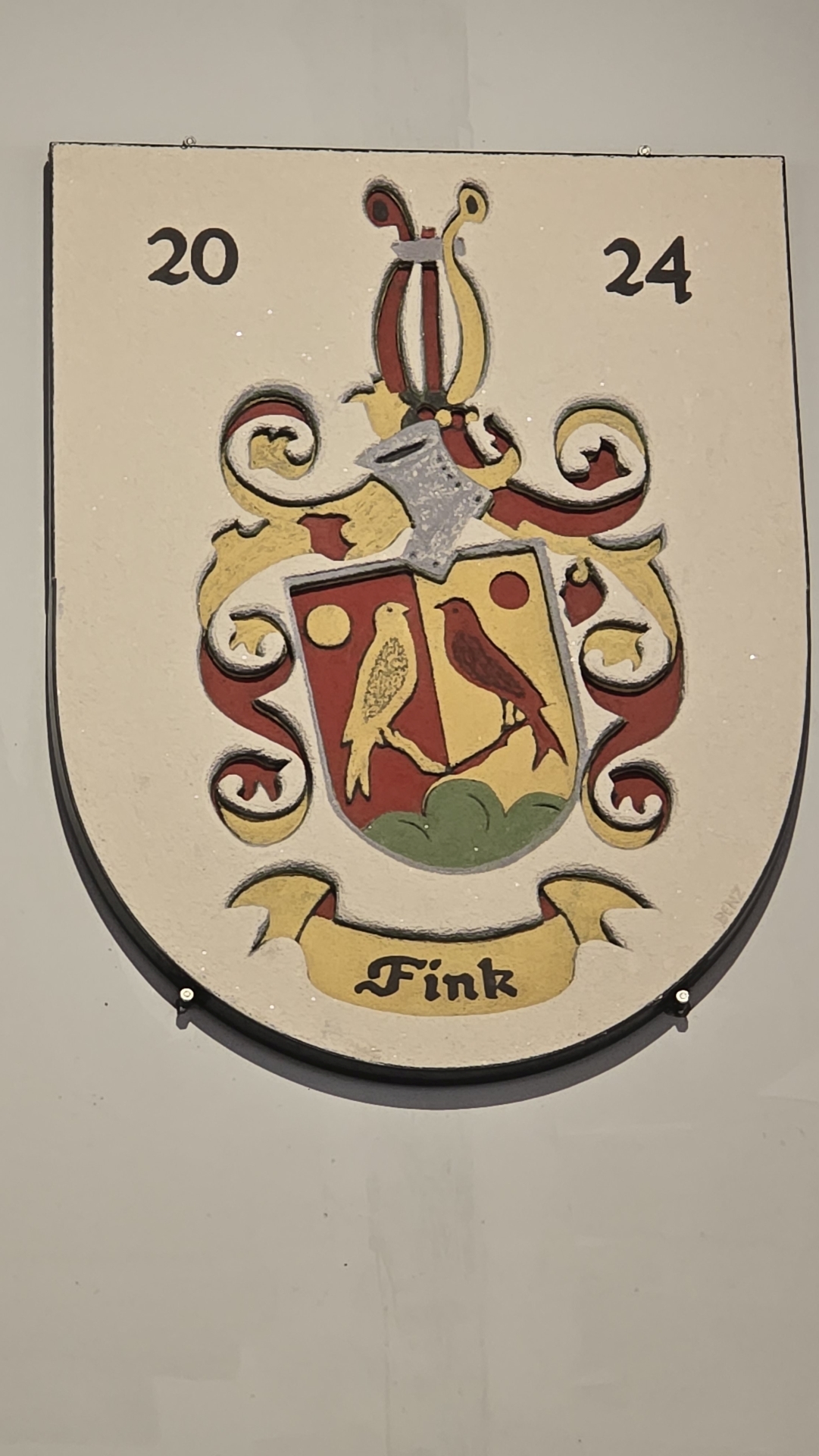 Das Familienwapper der Finks. Eine mehrlagige Gipsarbeit mit Schichten in verschiedenen Farben. Hier wird dann die jeweilige Schicht in aufwendiger Handarbeit freigelegt, sodass sich ein farbiger Gesamteindruck ergibt.