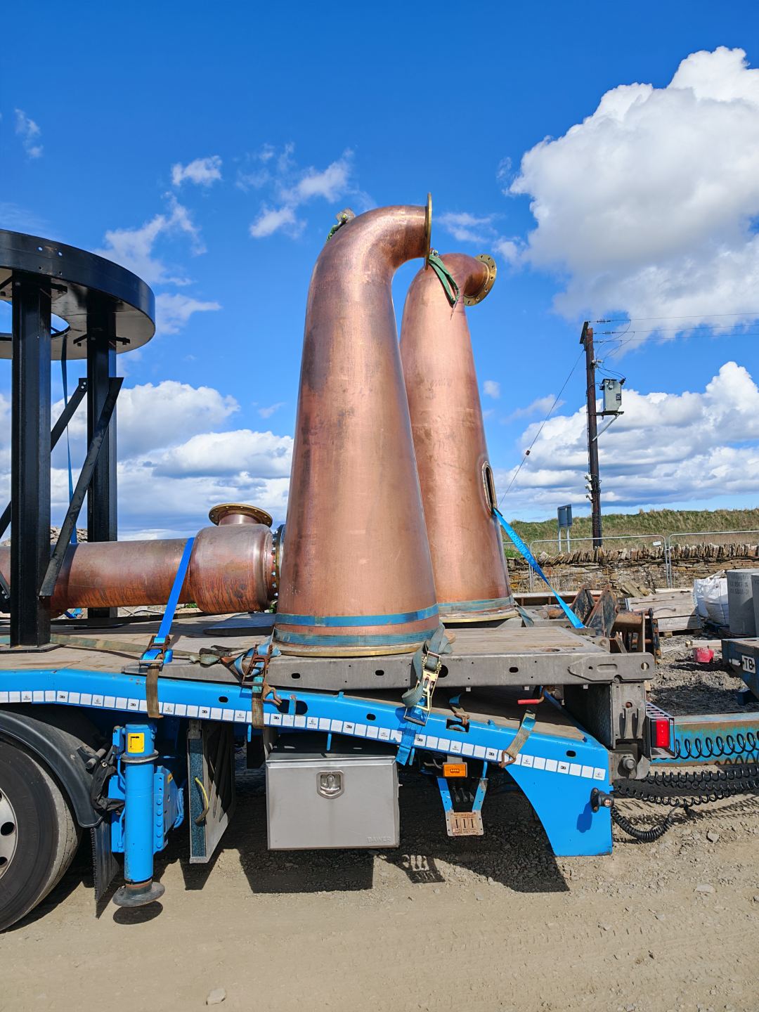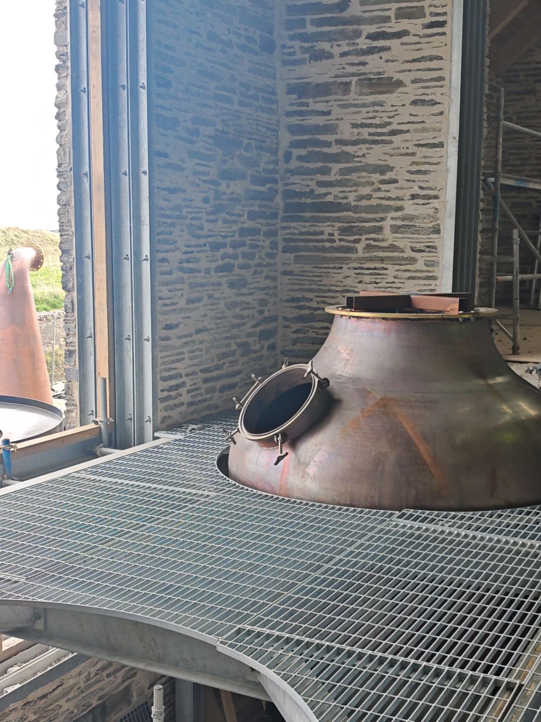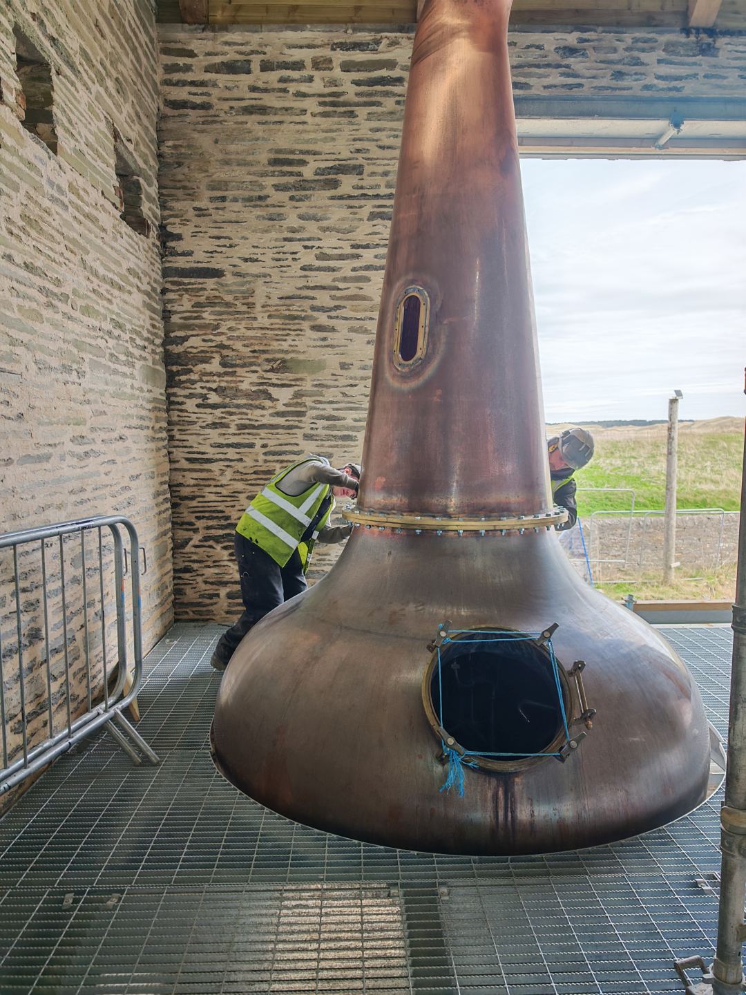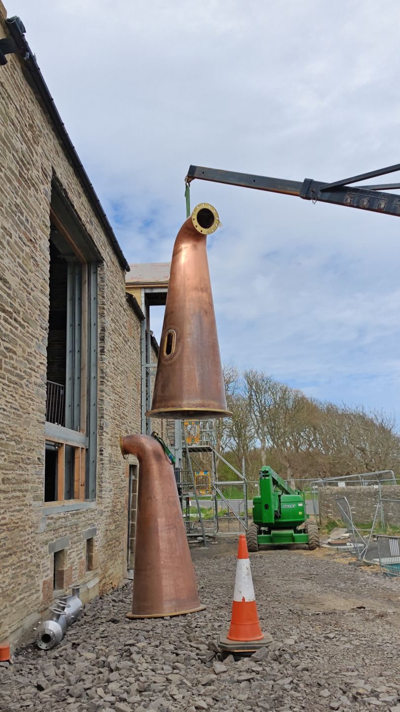 Übrigens: Mit dem Einbau der Stills geht eine Ära zu Ende: Die Stills sind die allerletzten, die das Label der Speyside Copper Works tragen werden (man hat dort zum Beispiel auch die Stills von Ardnahoe, die der Port of Leigh Distillery oder jene der neuseeländischen Scapegrace Distillery gebaut).