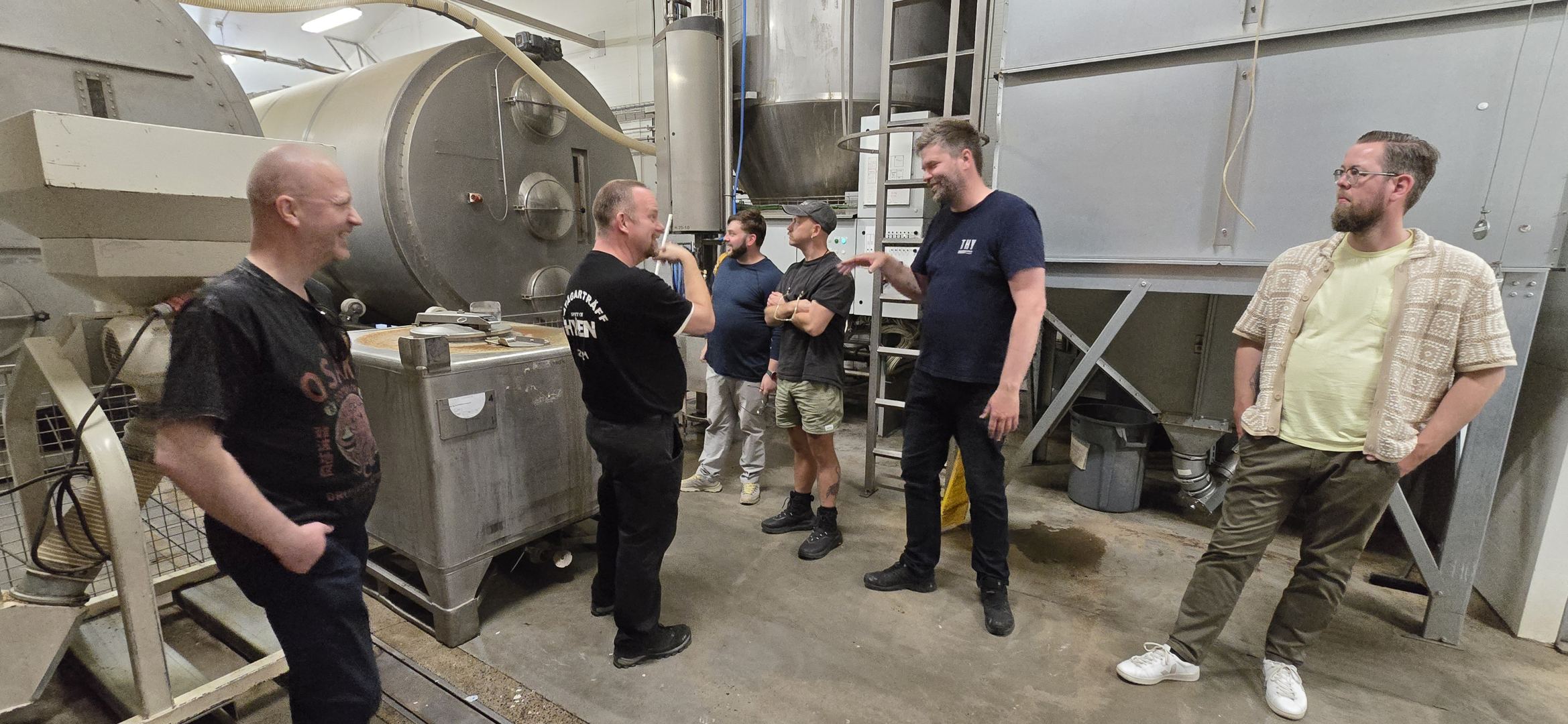 Fachsimpeleien vor einer der Mälztrommeln am Bauernhof