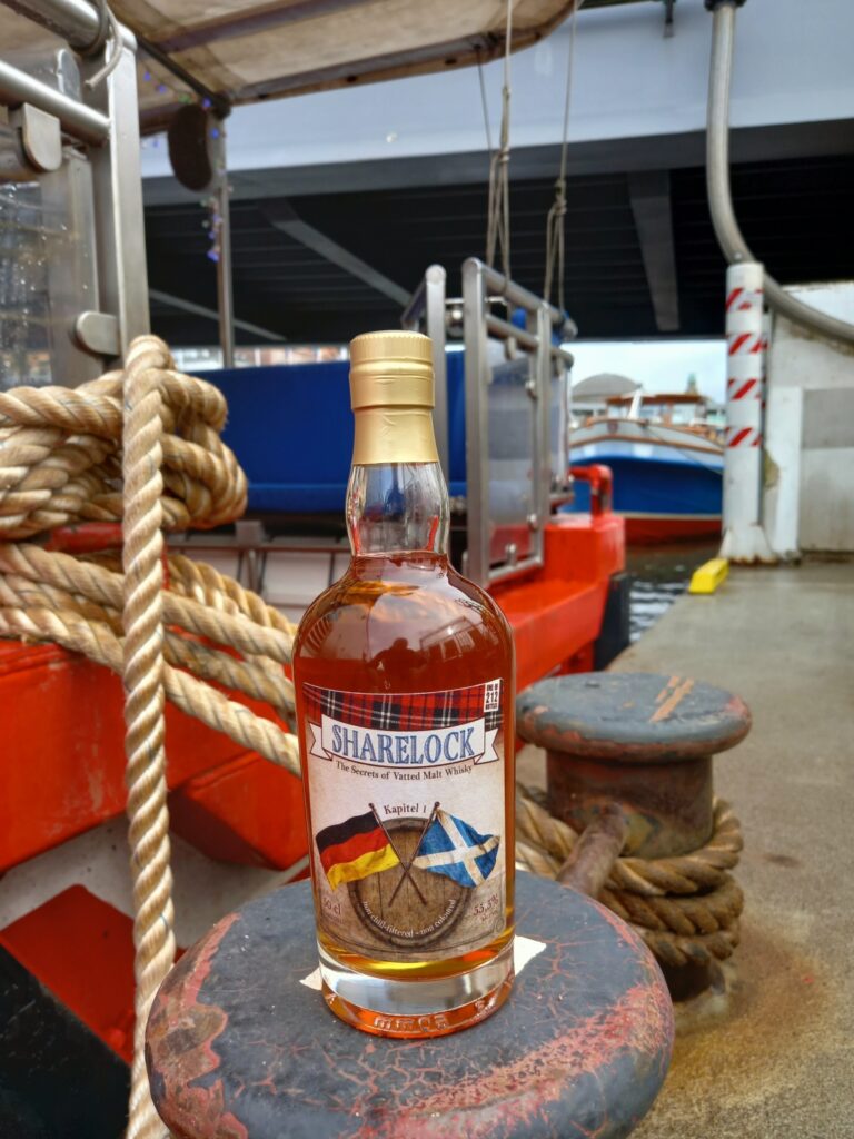 SHARELOCK – The Secrets of Vatted Malt Whisky – Kapitel 1 ist limitiert auf 212 Flaschen zu 0,5 Liter, abgefüllt in voller Fassstärke mit 55,5% vol. und für 59,50 € je Flasche zu haben.