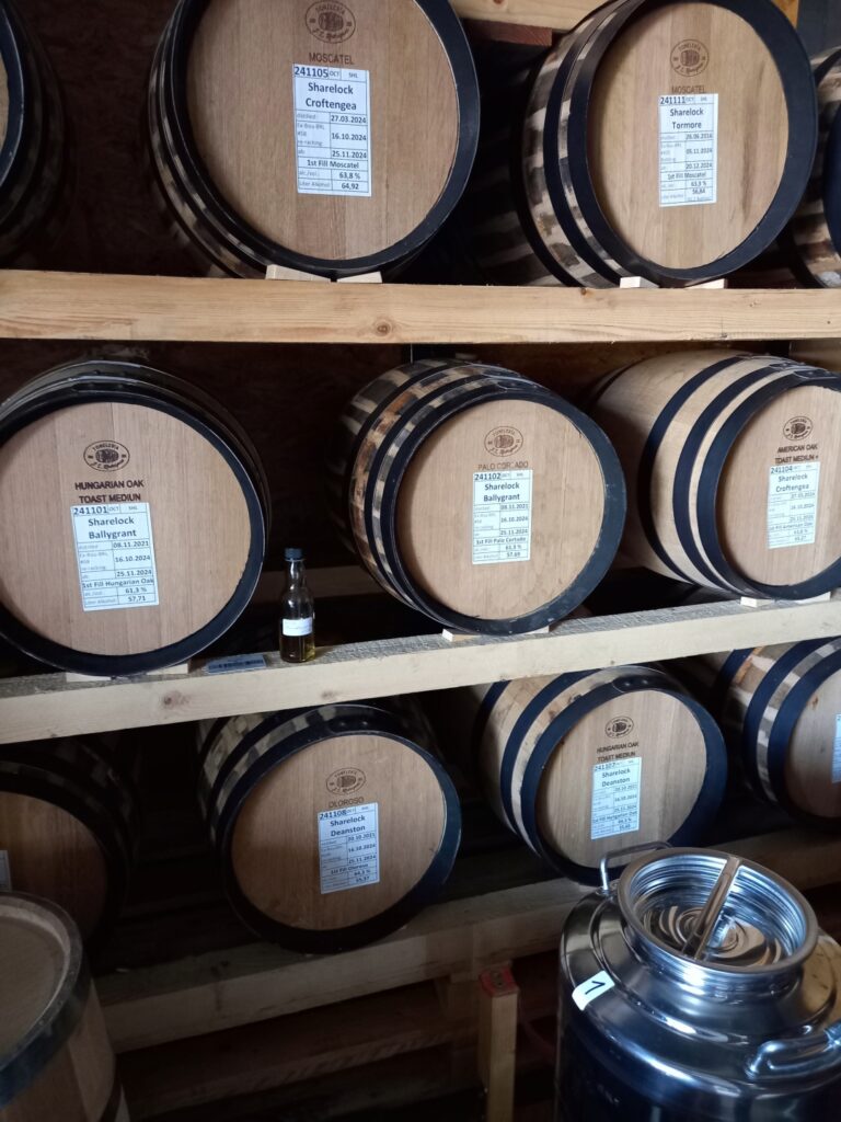 Für die unterschiedlichen Kapitel können wir auf Komponenten aus dem großen Stock des Whisky Warehouse No. 8 in Schottland und Winsen zurückgreifen, aber auch auf ausgesuchte Rückstellungen längst vergangener Abfüllungen aus den Archiven. Parallel dazu bauen wir seit 2024 für dieses Projekt einen eigenen Lagerbestand an Schottischen Newmakes, Young Spirits und jungen Whiskys auf, welche wir bei uns sorgsam in Fässern unterschiedlichster Vorbelegungen weiterreifen, um für kommende Sharelock-Kapitel kontinuierlich die Palette der möglichen Aromen für die Komposition zu vergrößern.